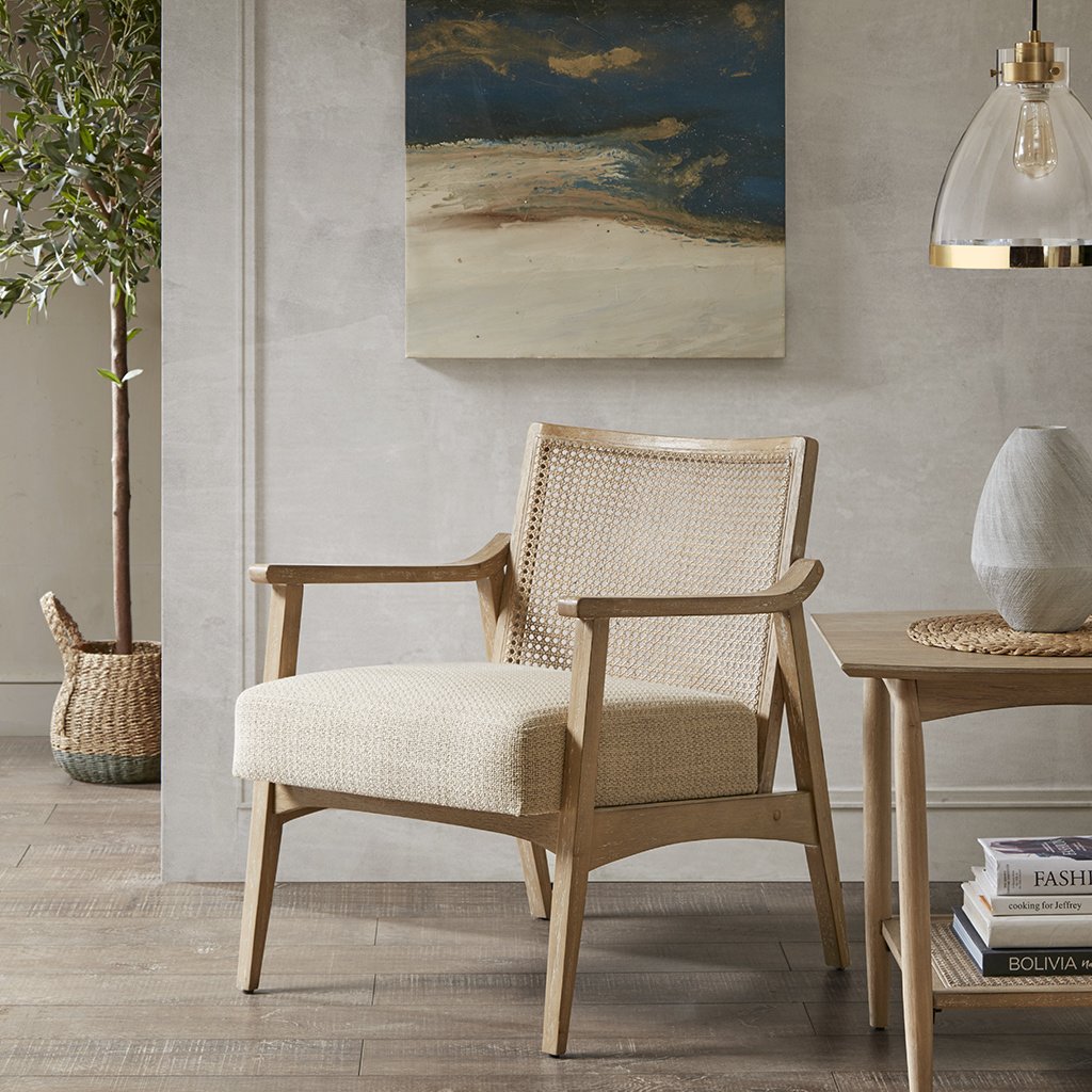 The INK+IVY Kelly Accent Chair offers a charming urban farmhouse appeal to your home decor. Featuring a cane inset back and an upholstered seat, this lounge chair provides exceptional comfort. The solid wood frame showcases a reclaimed wheat finish and classic mid-century styling, for a warm and natural look. Place this lounge chair in your living room or home office to give your space a pleasantly relaxing allure. Assembly is required.