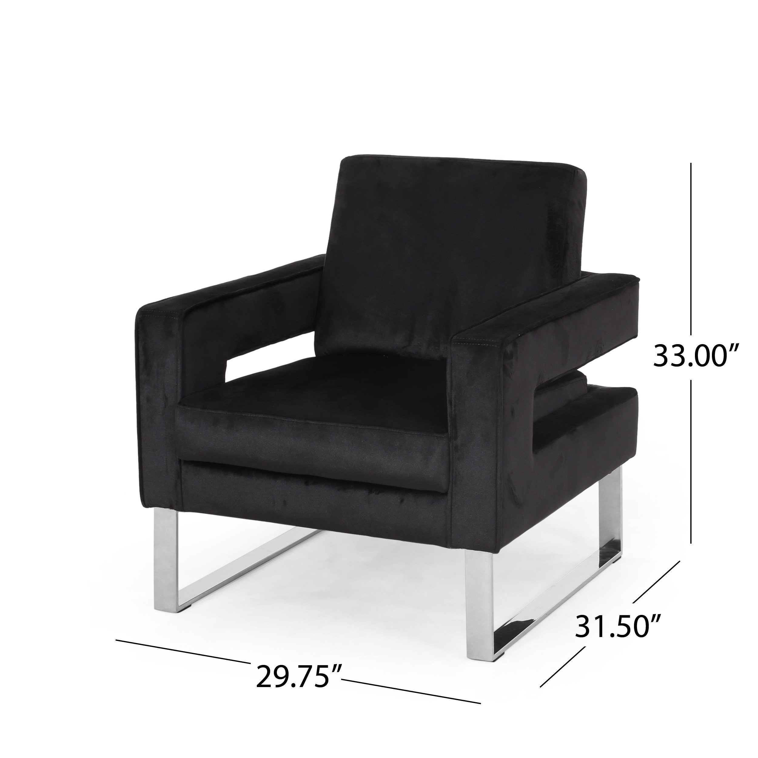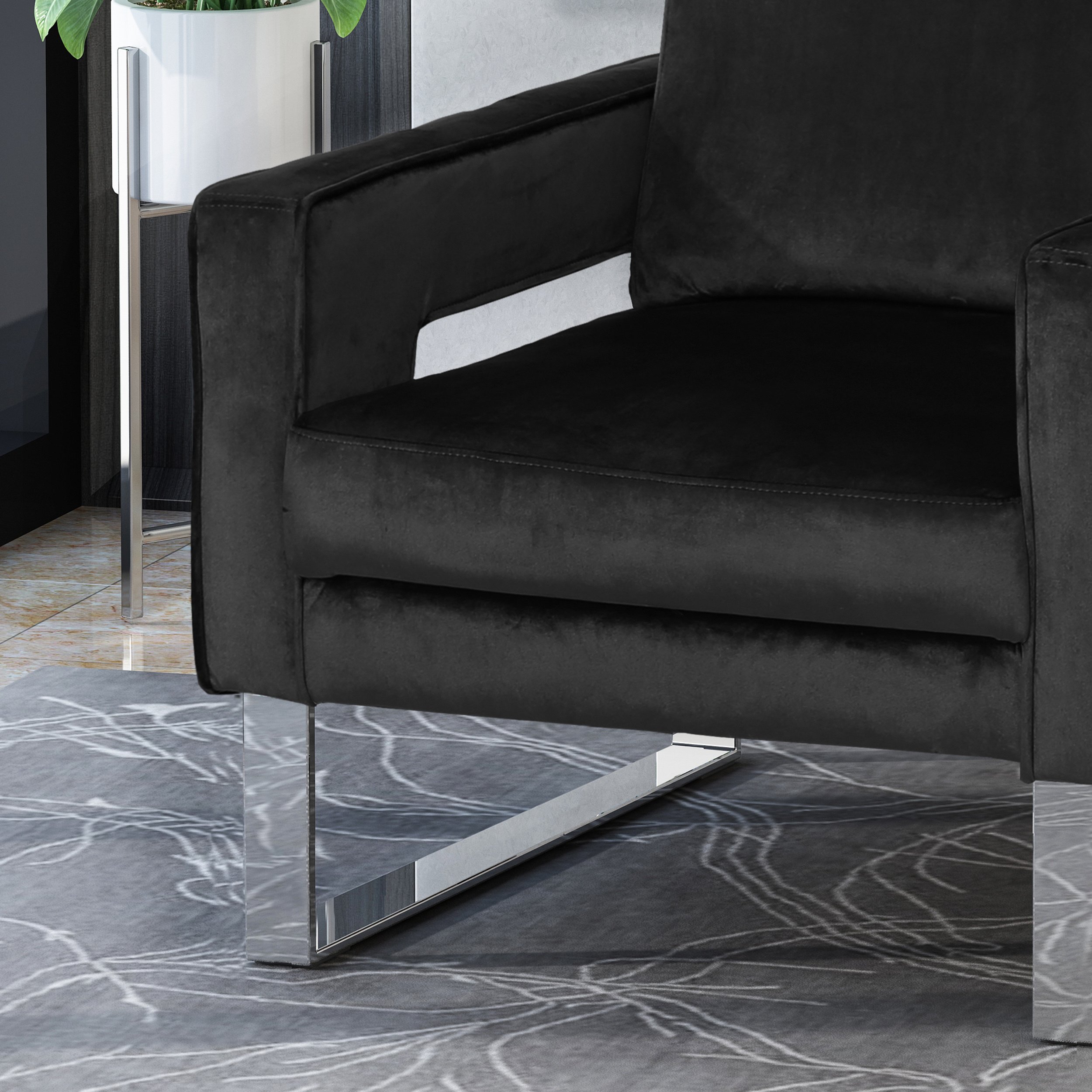 Modern glam: our Club chair showcases dazzling silver accents and velvet upholstery that pair seamlessly with clean, straight Lines for a luxurious modern glam look. Complemented with precise angles and minimalistic structure, This chair brings a sleek touch to any decor.