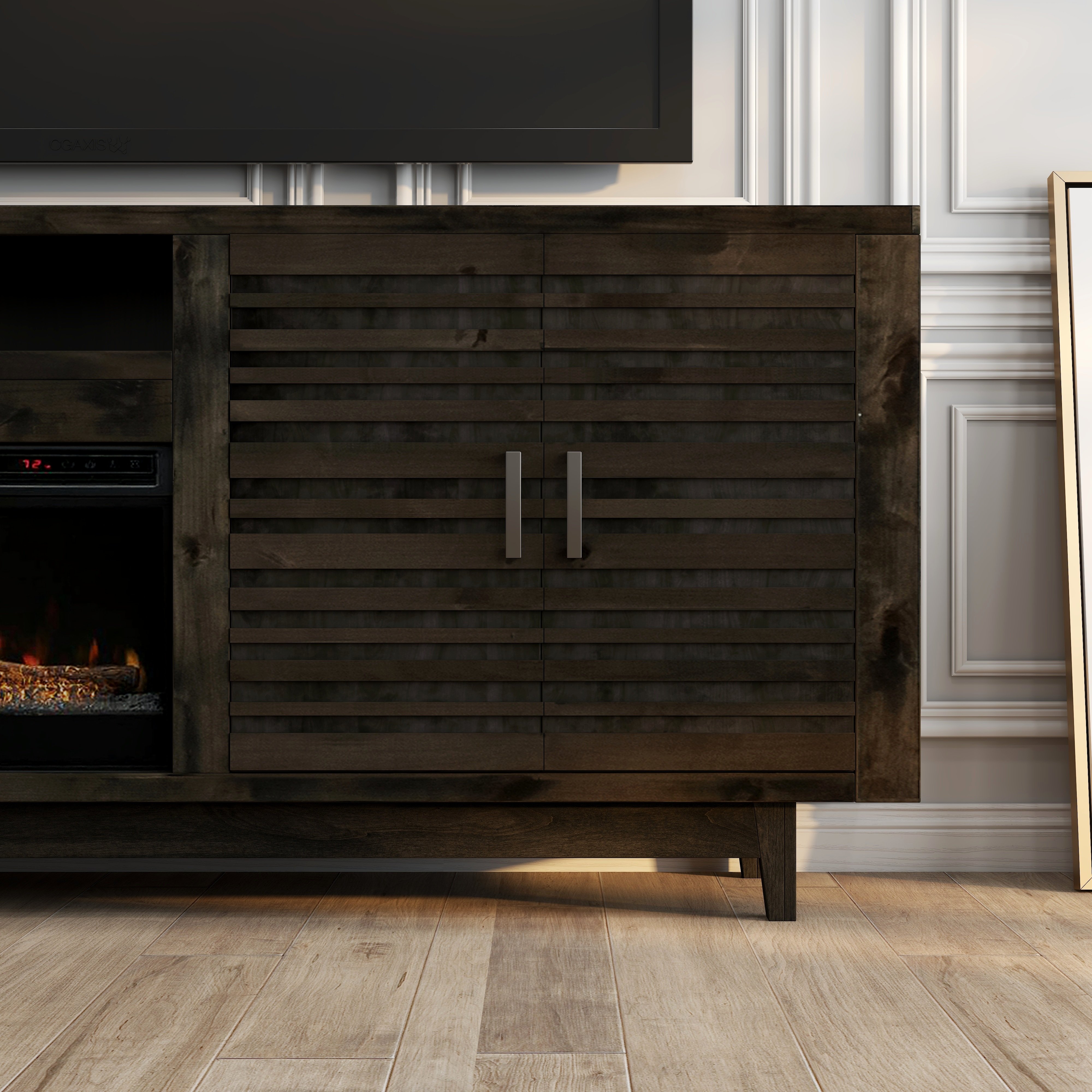 Give your living room a modern upgrade with the Avondale 83 inch Electric Fireplace TV Stand from Bridgevine Home. The perfect blend of minimalist, Scandinavian design with a slightly gritty, urban feel, this fireplace TV stand is adeptly crafted from Knotty Alder solids and veneers in a heavily distressed, dark Charcoal- Brown finish and Brushed Nickel hardware and tapered leg. Featuring two shelves and two doors accented with horizontal slat details, this fireplace entertainment center will accommodate TVs up to 95 inches and provide ample storage for media and gaming consoles and home décor favorites. Cable management openings on the back panel will keep every cord and wire concealed. The 42 inch electric fireplace insert includes a remote control and multiple settings allow for heat up to 400 square feet. Four (included) screws make securing the fireplace insert to the console quick and simple.