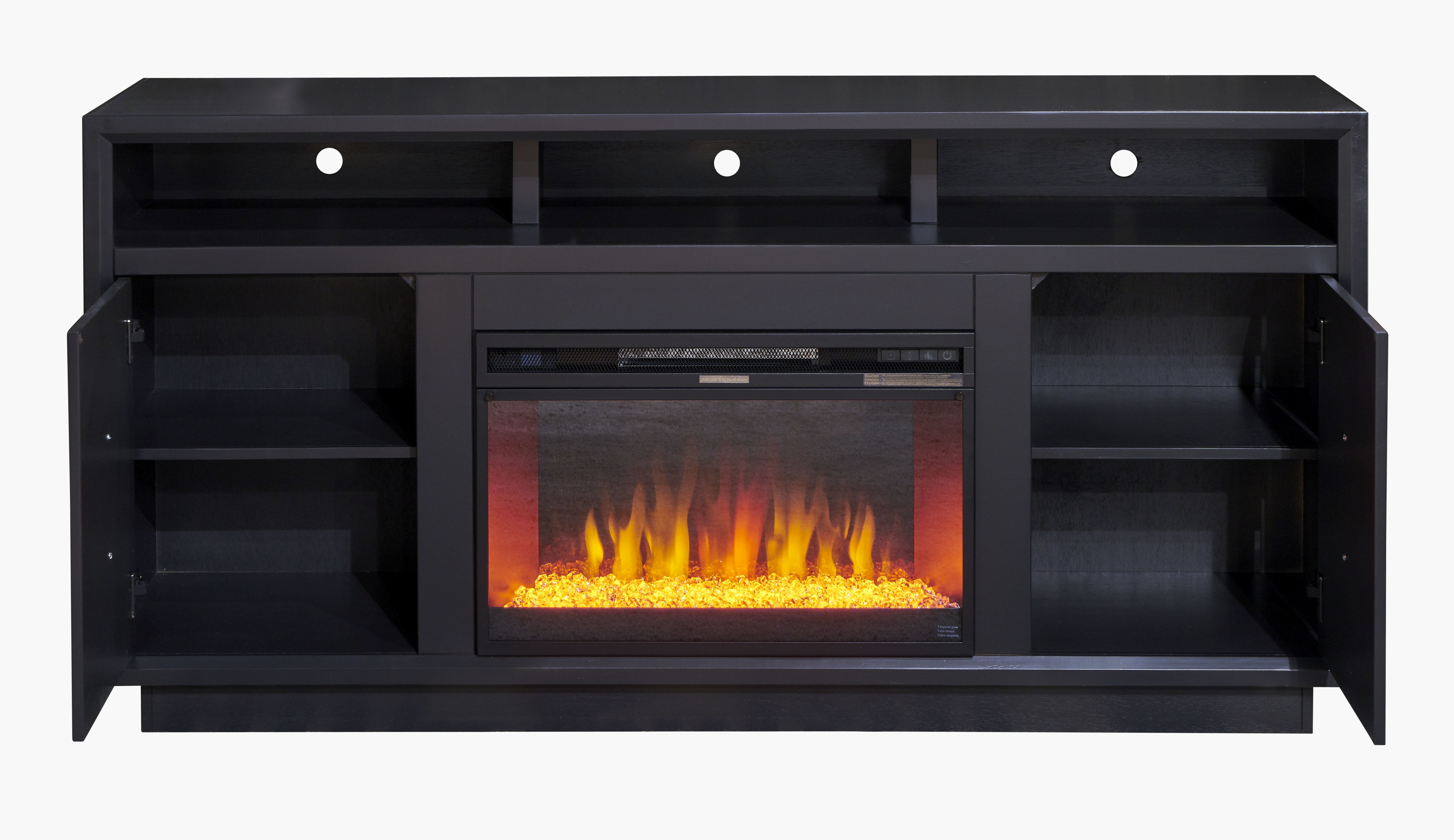 Description: The Sunset 67 inch Electric Fireplace TV Stand Console from Bridgevine Home is exquisitely crafted. It is finished in  Black and completed with elongated nickel hardware and a plinth base. This Fireplace TV Console will accommodate TVs up to 80 inches and two doors and one open shelving area will provide ample storage for media and gaming consoles. Cable management openings on the back panel will keep your cords and wires concealed. The 26 inch electric fireplace insert includes a remote control and multiple settings allow for heat up to 400 square fee.