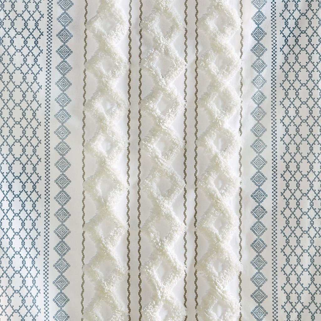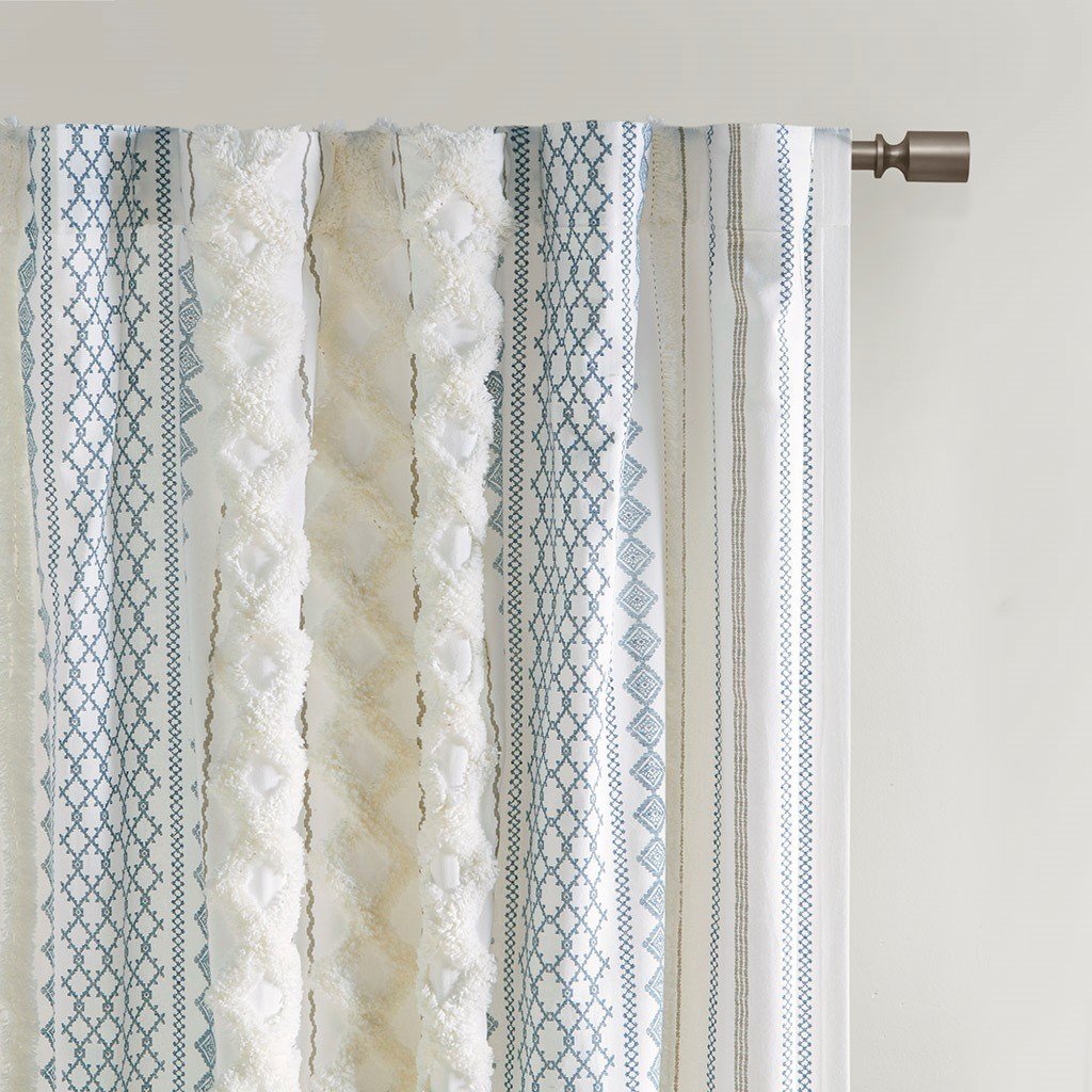 The INK+IVY Imani Cotton Printed Window Panel with Chenille Stripe and Lining offers a chic and casual update to your home. This ivory window panel features a navy geometric print with a tufted chenille stripe trim, for a textured artisanal look and feel. A lightweight white cotton lining on the reverse softly filters light, while providing better drapability and added privacy. In addtition, this 100% cotton curtain panel is also OEKO-TEX certified, meaning it does not contain any harmful substances or chemicals for the best in quality comfort and wellness. Each panel is finished with a rod pocket top for easy hanging, and back tabs for a more clean and tailored finish. This window panel is sold as a single and 2 window panels must be purchased to cover any standard size window. Complete the look with coordinating bedding sets and bath decor, available and sold separately.