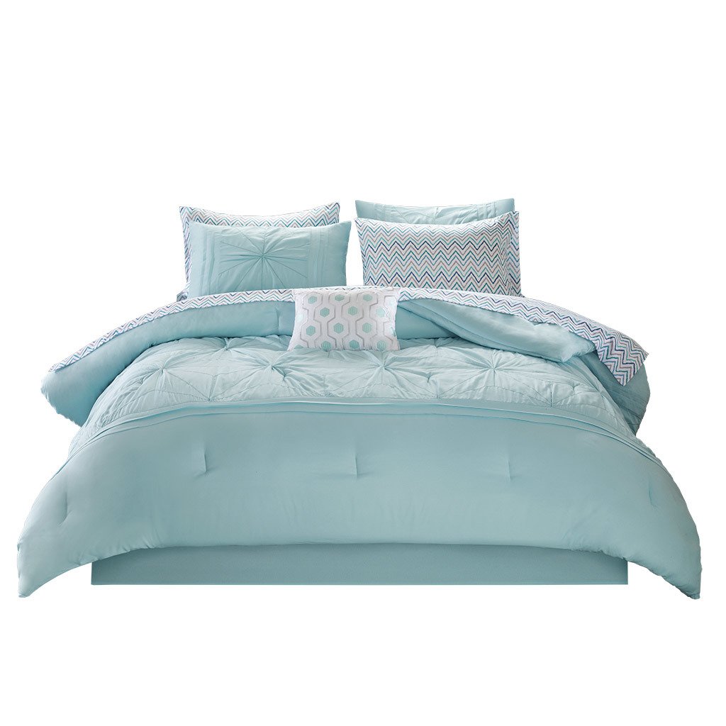 The Intelligent Design Toren Embroidered Comforter Set with Bed Sheets flaunts a simple elegance to elevate your bedroom. Embroidered pleating and stitching details adorn the top of the soft aqua comforter, adding texture and dimension to the top of the bed. Stylish shams (1 in Twin/TwinXL) display a similar pleated design and embroidered detailing seen on the comforter creating a fully coordinated look. A colorful chevron print sheet set and gorgeous decorative pillow adds a fun splash of color and style. The solid bed skirt provides a crisp and clean finishing touch to the comforter set. This bedding set is also OEKO-TEX certified, meaning it does not contain any harmful substances or chemicals to ensure quality comfort and wellness.