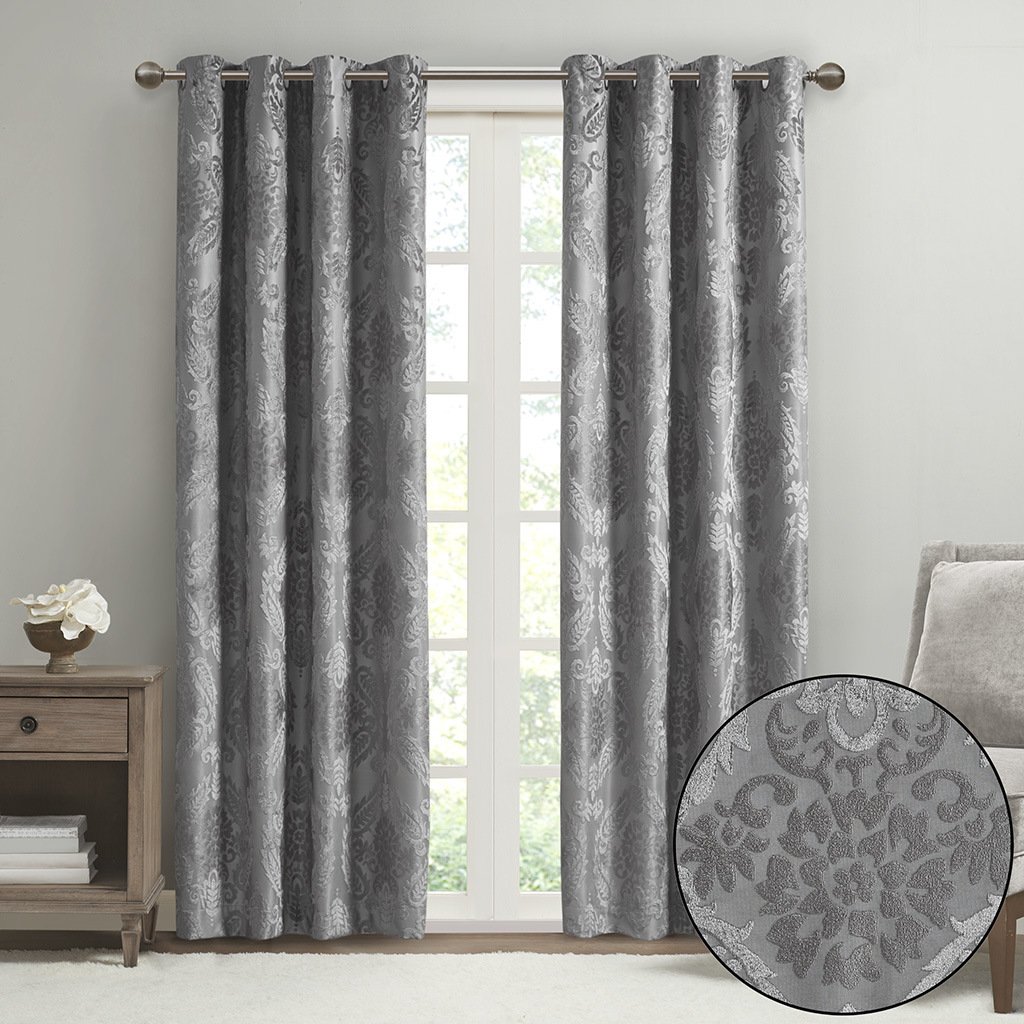 Our SunSmart Amelia Knitted Jacquard Paisley Total Blackout Grommet Top Curtain Panel adds the perfect touch of traditional elegance to your home. This total blackout grey curtain features an intricate paisley design on a heavy textured jacquard fabric, providing a rich and luxe sheen for beautiful texture and dimension. The foamback and bonding finish on the reverse makes this curtain 100% total blackout, blocking out all exterior light and noise intrusion for maximum privacy while also using thermal layer technology for energy efficiency and maximum energy savings. A silver grommet top finish makes this panel easy to hang, open, and close throughout the day; grommets fit up to a 1.25 inch diameter rod. As shown in image, 2 curtain panels will need to be purchased to provide coverage for any standard size window since this panel is sold as a single.