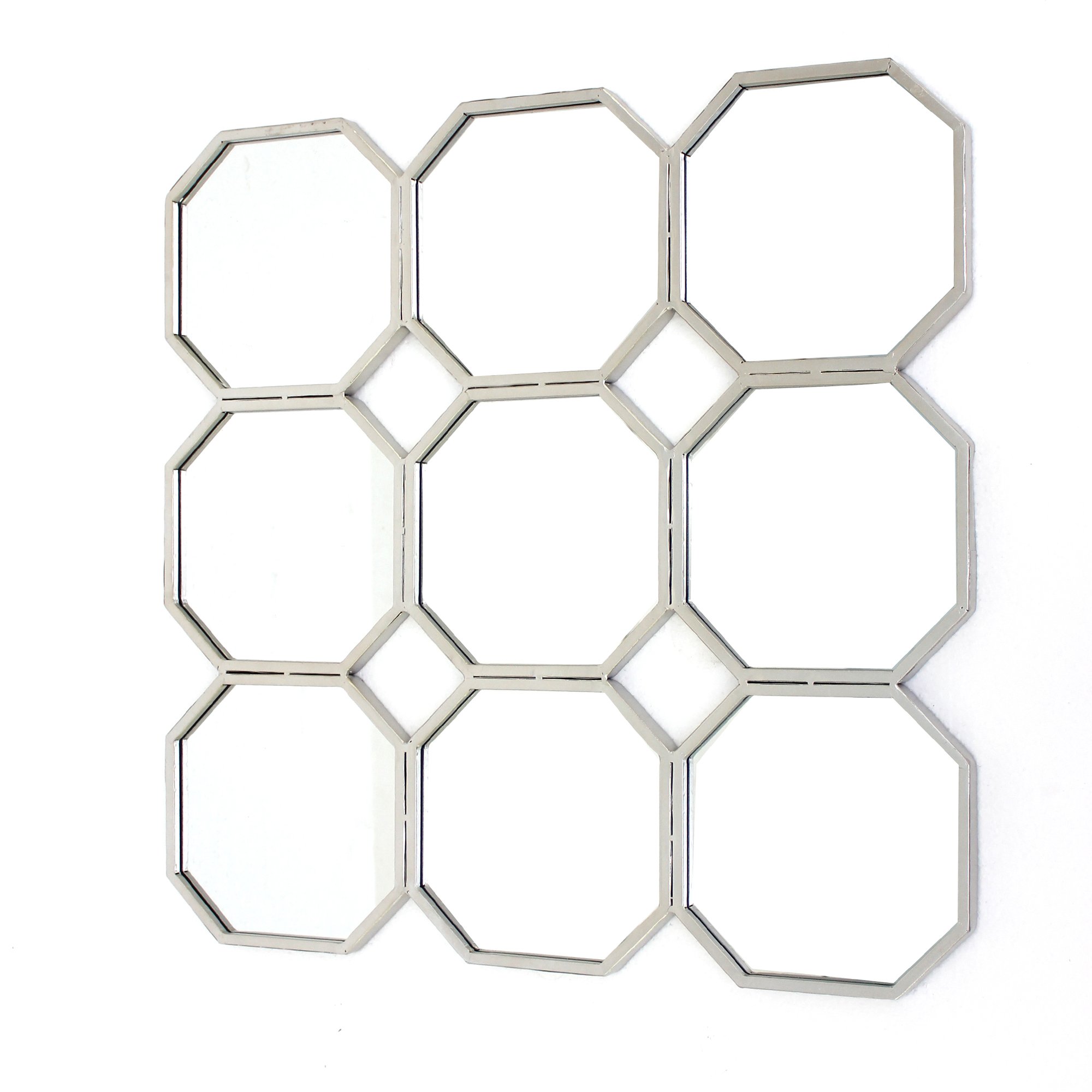 this is wall art taken to the highest pedestal of elegance, creativity and style. our inspirational mirrored metal wall sculpture is perfectly designed with a contemporary touch to create an elegant visual effect that resonates. it features nine individual octagonal mirrors with stunning, contemporary geometric pattern that inspires awe and amazement. give your living space that industrial inspired styling that will creatively transform the decor into a more cozy and peaceful ambience. - contemporary collection - metal frame - silver finish - 9 individual - octagonal mirrors - welding craft