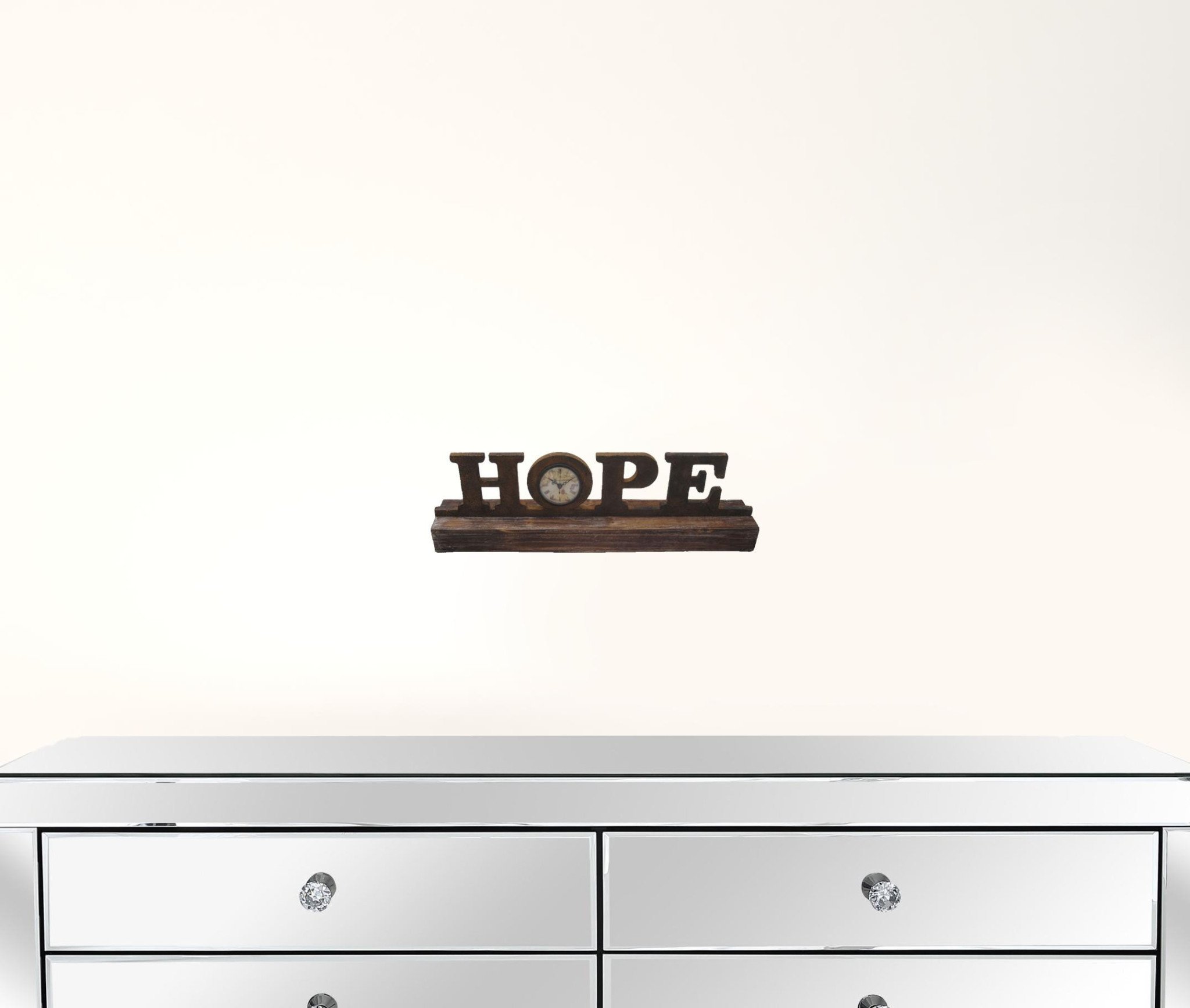 our standing decor clock is creatively designed to add hopeful ambience and stylish look to your home. it features an elegant distressed wooden finish with an inspiration word hope to brighten your home settings. this decor clock can easily fit into your indoor or outdoor arrangement