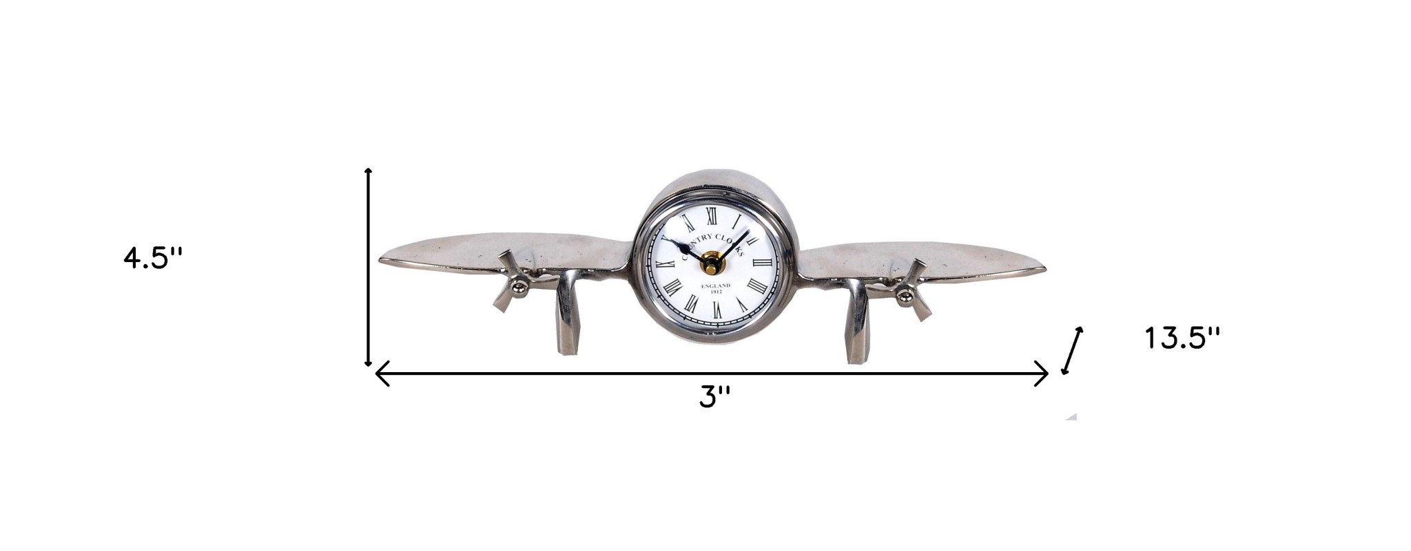 This unique aeroplane clock comes with the clock in the center of the wings. It features 100% hand-cast in solid aluminum and topped with a nickel-plated finish. The clock run with one AA battery (not included) and has a white face finish with Roman numerals numbers for a vintage look. Every detail on the model is hand polished to a high luster. This aeroplane clock is a perfect addition to any aviation enthusiast home or office!