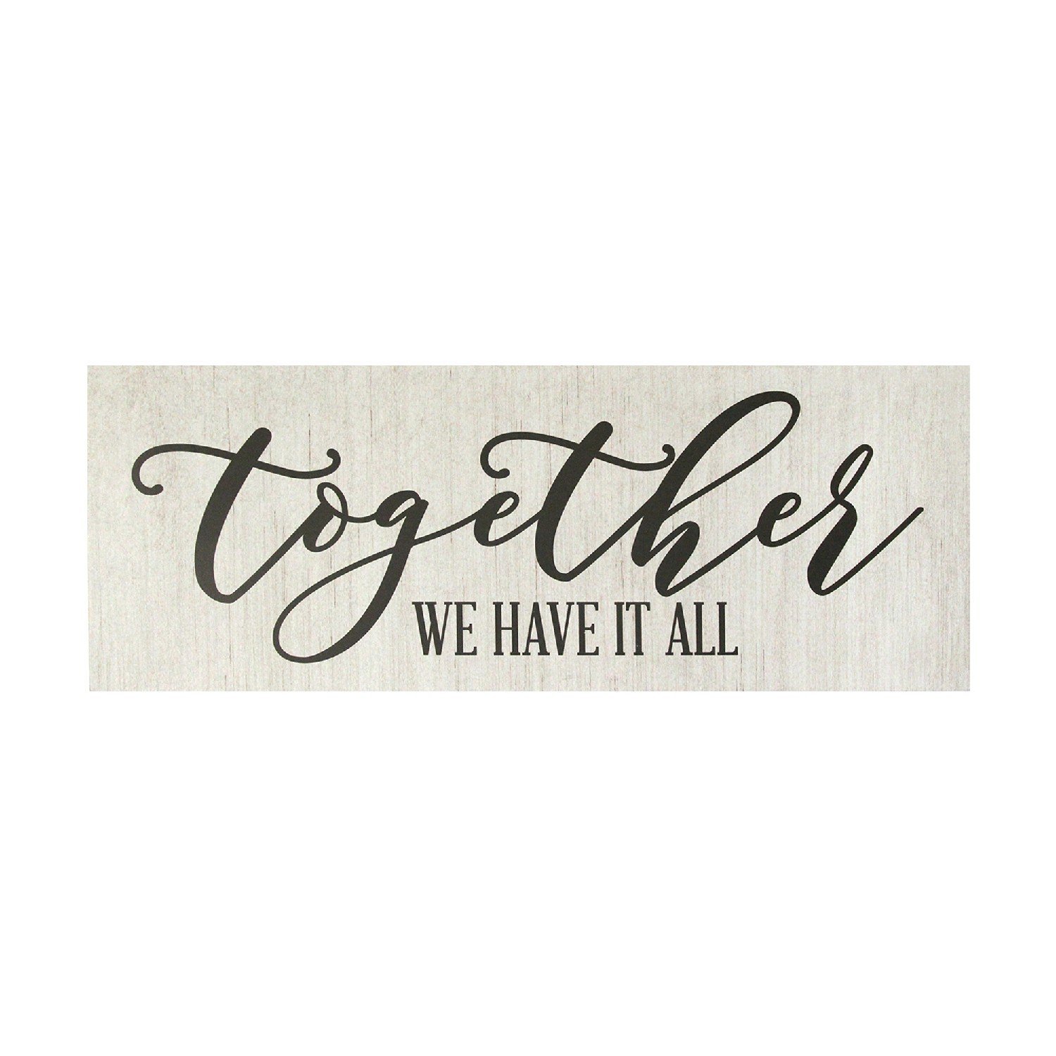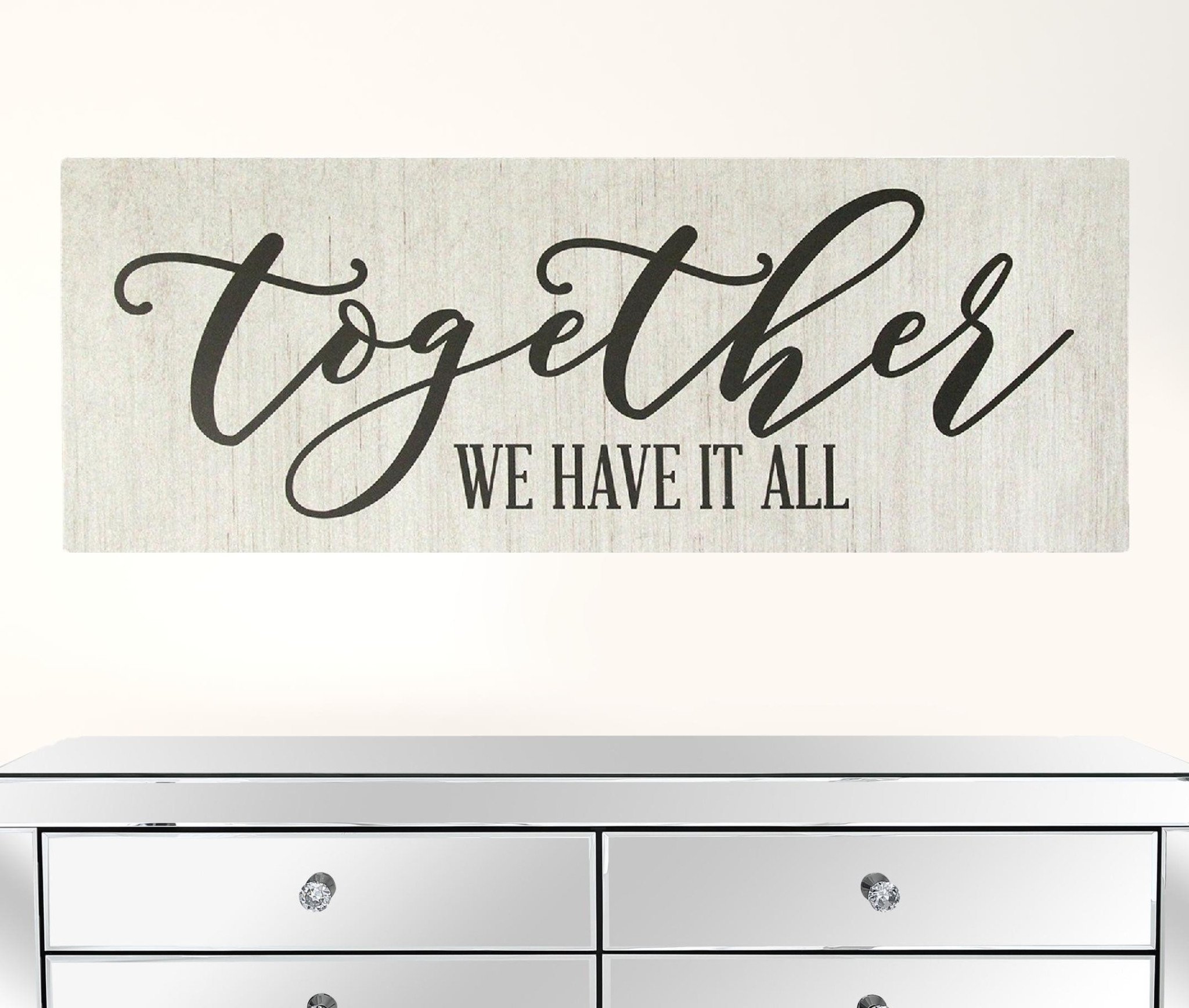 Put your feelings on display with the "Together We Have It All" Oversized Wall Art. This frameless wall art is handcrafted in a simplistic design letting the words Together We Have It All be the main focal point. The five words in bold type emphasize the meaningful message. Printed on faded grain white paper on board with a large footprint measuring 31.50" W x 1.18" D x 11.81" H, youll want to find a perfect spot to make a statement. Easy to hang with the attached V-hook on the back.