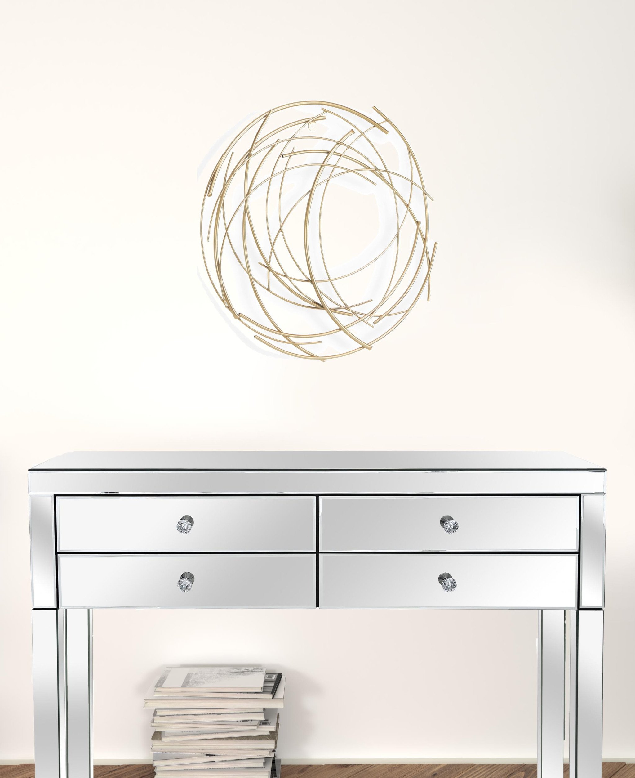 The gold metal abstract round hanging wall art decor is the perfect decorative accessory for your home. Hang on your wall to add some up to modern and contemporary fashion and decoration. This unique abstract overlapping wall art will instantly liven up your space. 25.5" around, this fun piece brings dimension to your walls. 25.5-inch H x 25.5-inch W x 1-inch D