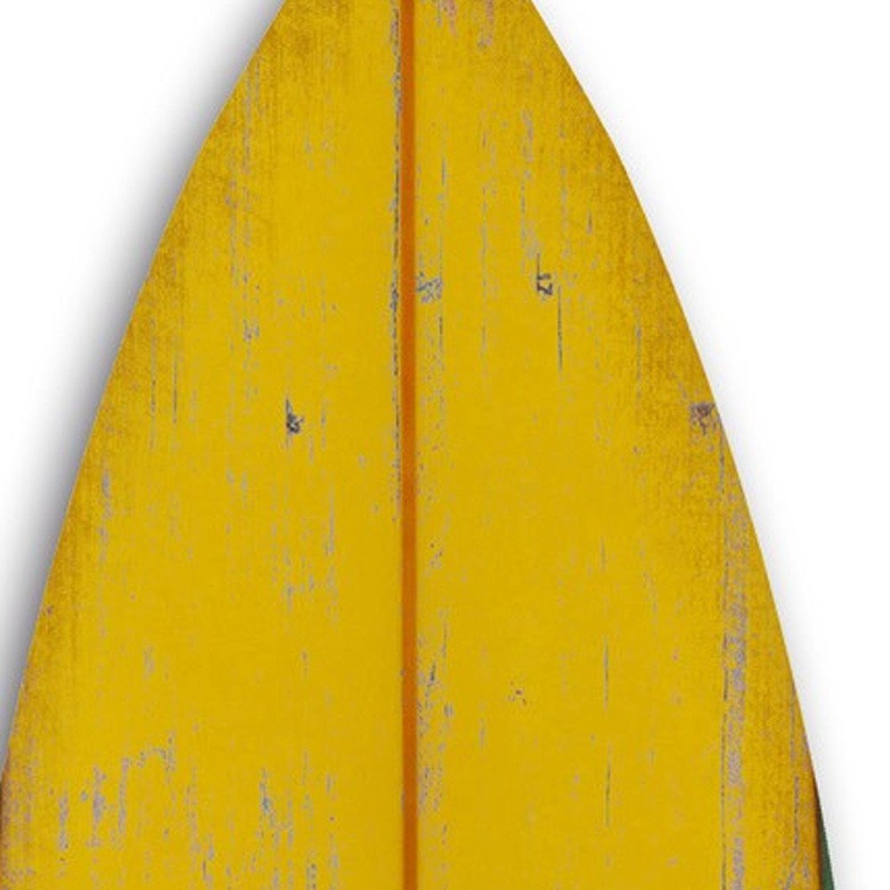 Surfs Up! This Distressed and Rustic Yellow Surfboard Wood Panel Wall Art features a vibrant golden yellow color with hints of green, printed on a high quality wood panel surboard replica. The natural and distressed wood and graphics make this piece so unique, fun, and authentic looking. This board makes a bold and colorful casual statement and is a great choice to decorate your space. Comes ready to hang with invisible mount and hardware on the back. 76" X 18" X 1" . Distressed worn finish/ desing on both sides / can be hung either vertical or horizontal orientation