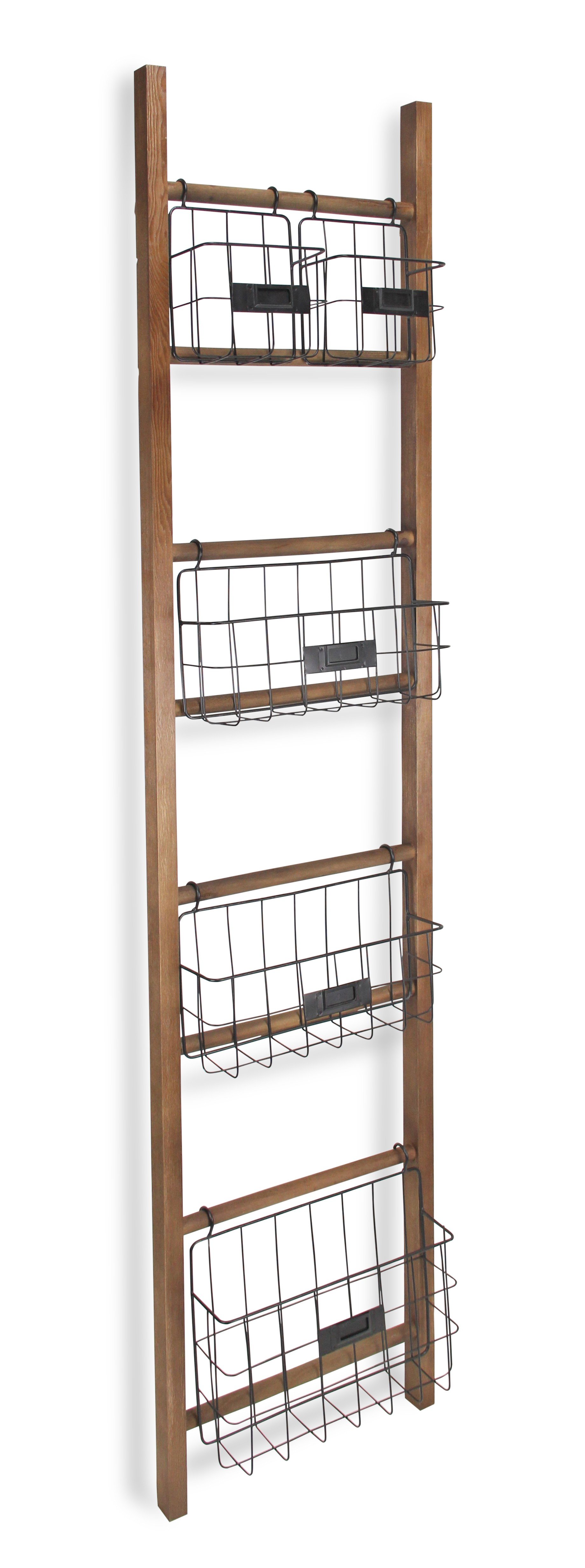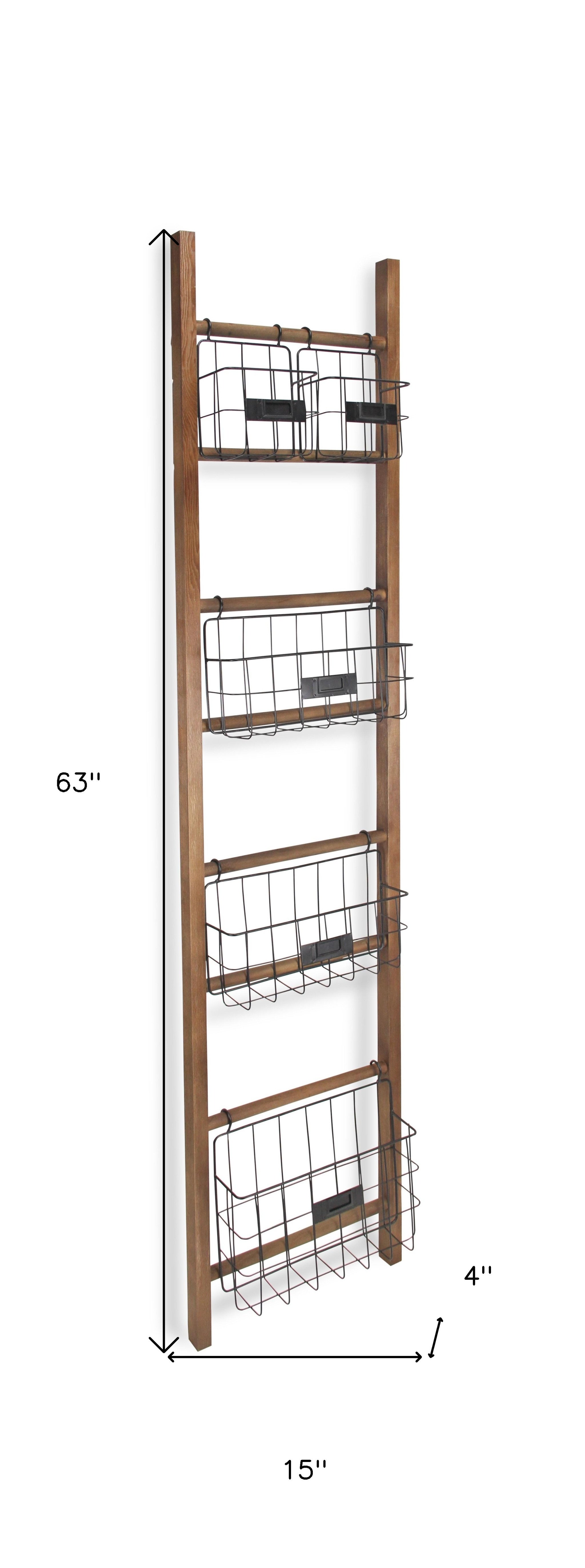 Maximize your storage space with this 63-inch natural and black wood and metal storage ladder shelf. Storage ladders are a trendy and stylish option for the home decorator looking to add a bit of warmth to their home while still maximizing available space. Perfect for a wide variety of rooms and design aesthetics, this piece in particular features a natural wood ladder along with 2 small, 2 medium and 1 large, removable metal storage baskets. With its handcrafted construction, this piece will provide a wonderful storage option that is both casually elegant and functional. 63-inch H x 15-inch W x 4-inch D