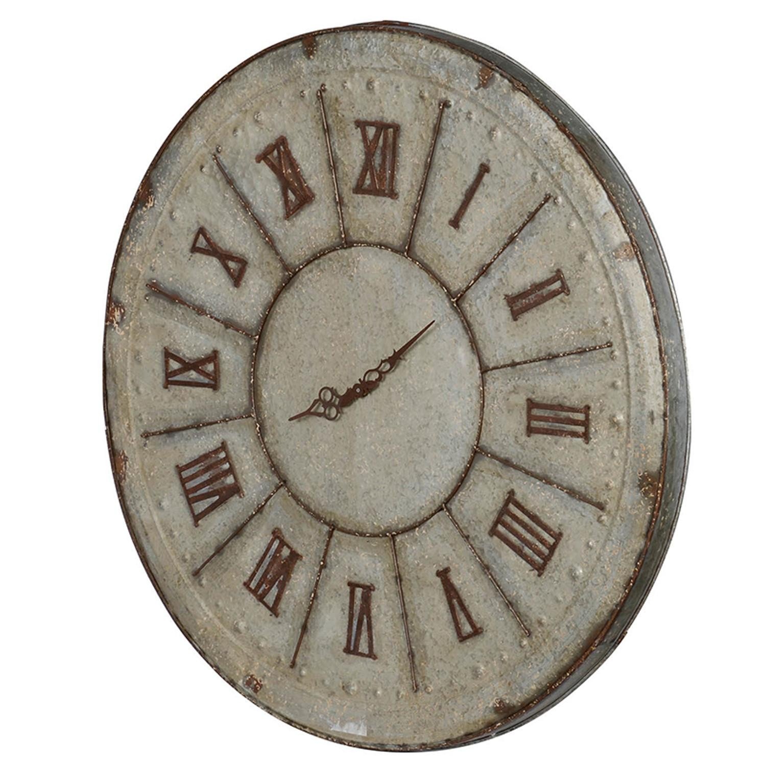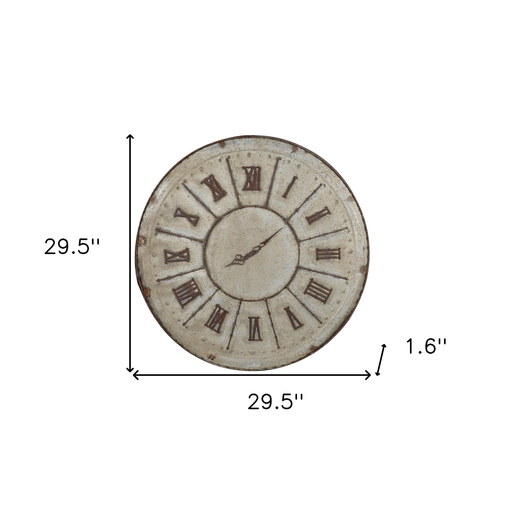 Stand out of the ordinary with this Rustic Farmhouse Distressed Tin Round Wall Clock that evokes a time-honored appeal in its design elements. The distressed and antiqued ivory/beige face features bronze-toned Roman numerals and a circular age-finished border for a striking appearance while the tiny hands add a taste of modern subtlety to the antique piece. With sturdy metal construction, this wall clock stands the test of time with enhanced strength and durability, allowing it to be used both as an indoor and outdoor piece of décor. Whether you place this wall clock in your bedroom, patio or living room, it will make a bold statement In the room. 29.5” x 29.5” x 1.6”