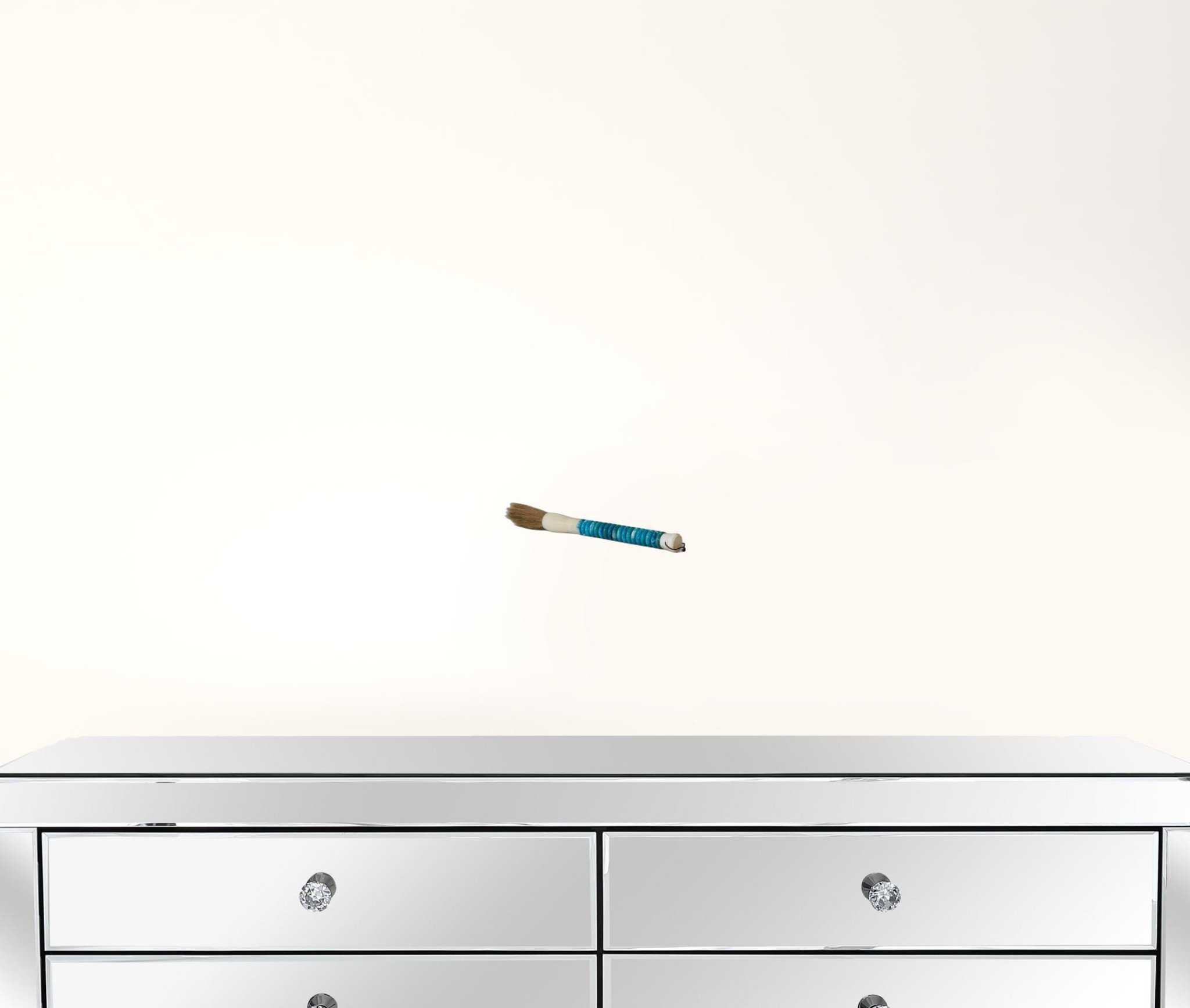 This aqua blue jade abacus disc decorative calligraphy brush will add a beautiful and unique accent to your decor. Inspired by the origins of calligraphy, this brush is now used as a decorative accent known as a sign of peace. Made of jade, which is known to be a gem of nobility and royalty, combined with fine horsetail for the brush, this unique accent is sure to be a statement piece. Can hang on the wall or use as tabletop accent. Instantly liven up your space with this art that brings color and dimension to your space. 1.5" H x 12" W x 1.5" D