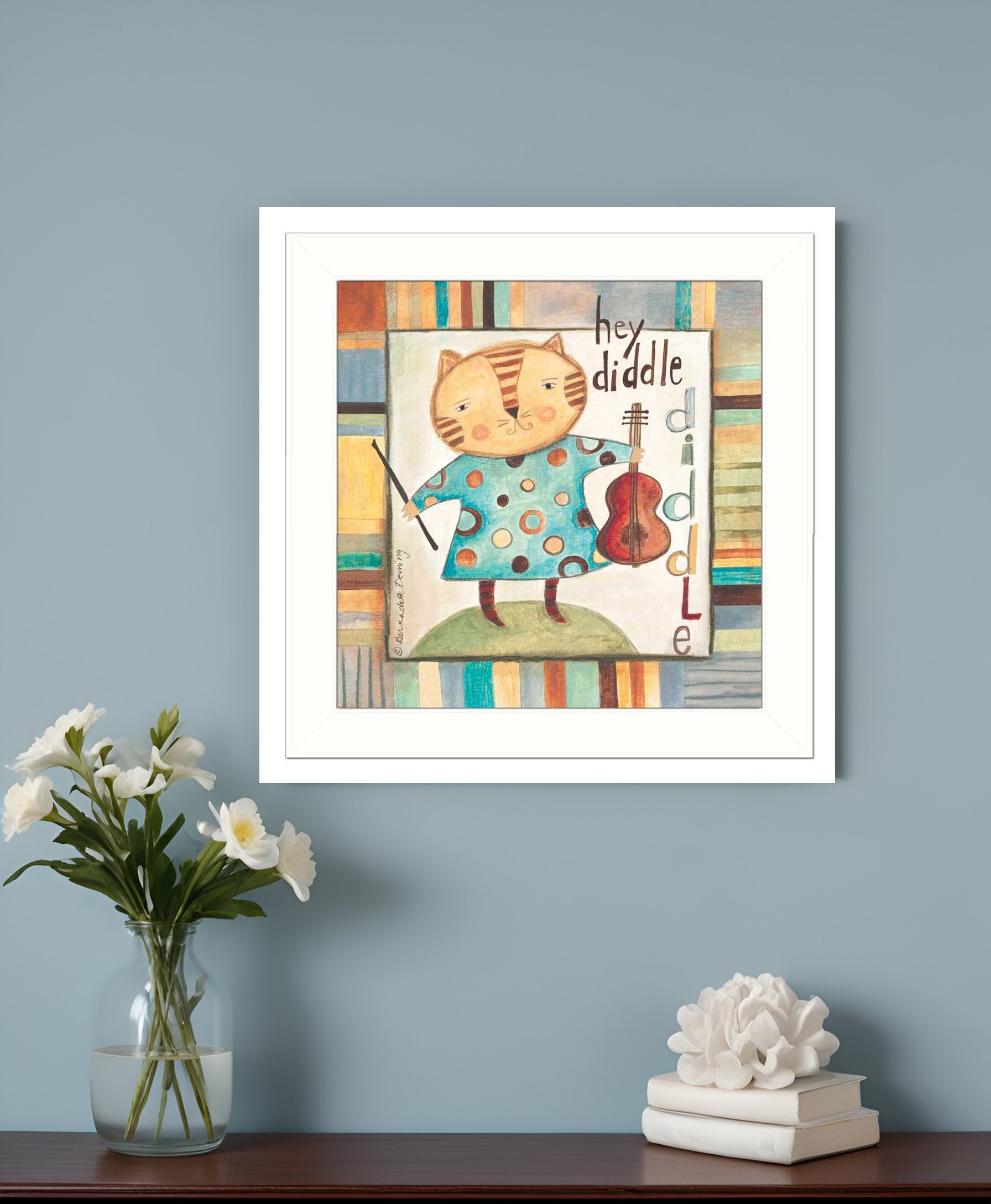 The hey diddle diddle white framed print wall art is the perfect decorative accessory for your home. This feline accent will bring a smile to your face. This print is a visual artistic expression that allows you to decorate your space in style. Reproduced for you on paper, this hanging decorative accent will be a trendy and fashionable way to dress your walls. Adding this hanging wall art to your space to make your room feel more finished and attractive. Utilize this opportunity to create a focal point in the room with this fabulous wall decor option. 14-inch H x 14-inch W x 1-inch D