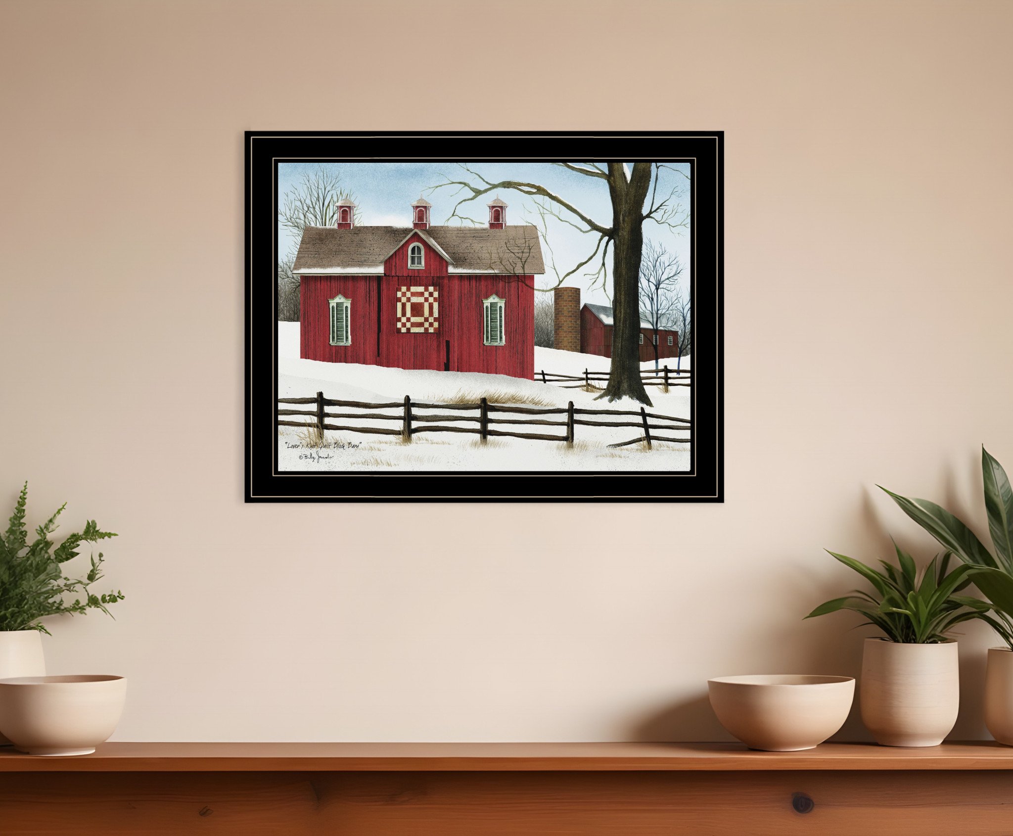 The lovers knot quilt block barn 4 black framed print wall art is the perfect decorative accessory for your home. This print is a visual artistic expression that allows you to decorate your space in style. Reproduced for you on paper, this hanging decorative accent will be a trendy and fashionable way to dress your walls. Adding this hanging wall art to your space to make your room feel more finished and attractive. Instantly liven up your space with this art that brings color and dimension to your walls. 21 inches H x 27 inches W x 1 inches D