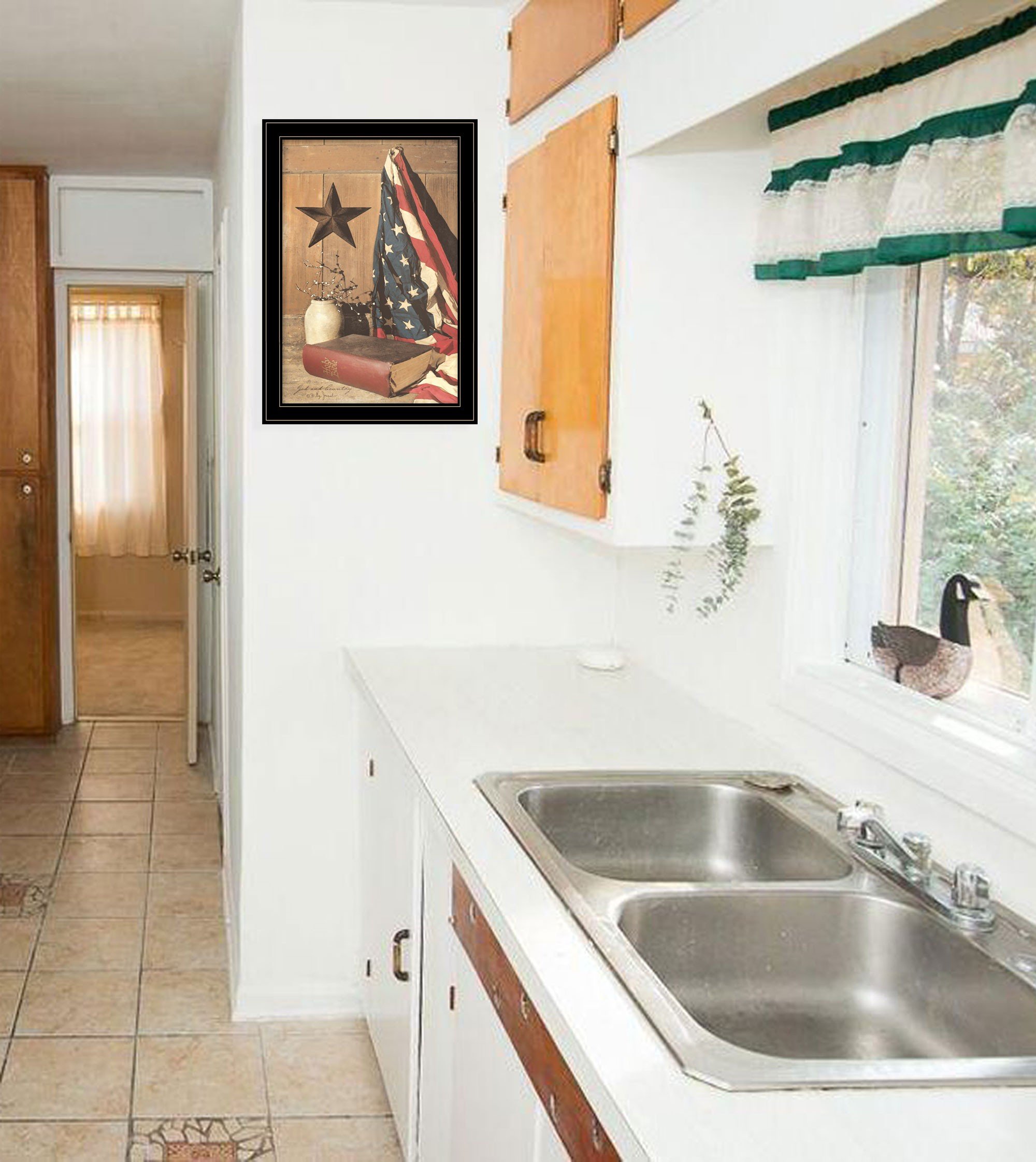 Unique and decorative, this god and country 6 black framed print wall art will leave a lasting impression. This print is a visual artistic expression that allows you to decorate your space in style. Reproduced for you on paper, this hanging decorative accent will be a trendy and fashionable way to dress your walls. Adding this hanging wall art to your space to make your room feel more finished and attractive. Utilize this opportunity to create a focal point in the room with this fabulous wall decor option. 21-inch H x 15-inch W x 1-inch D