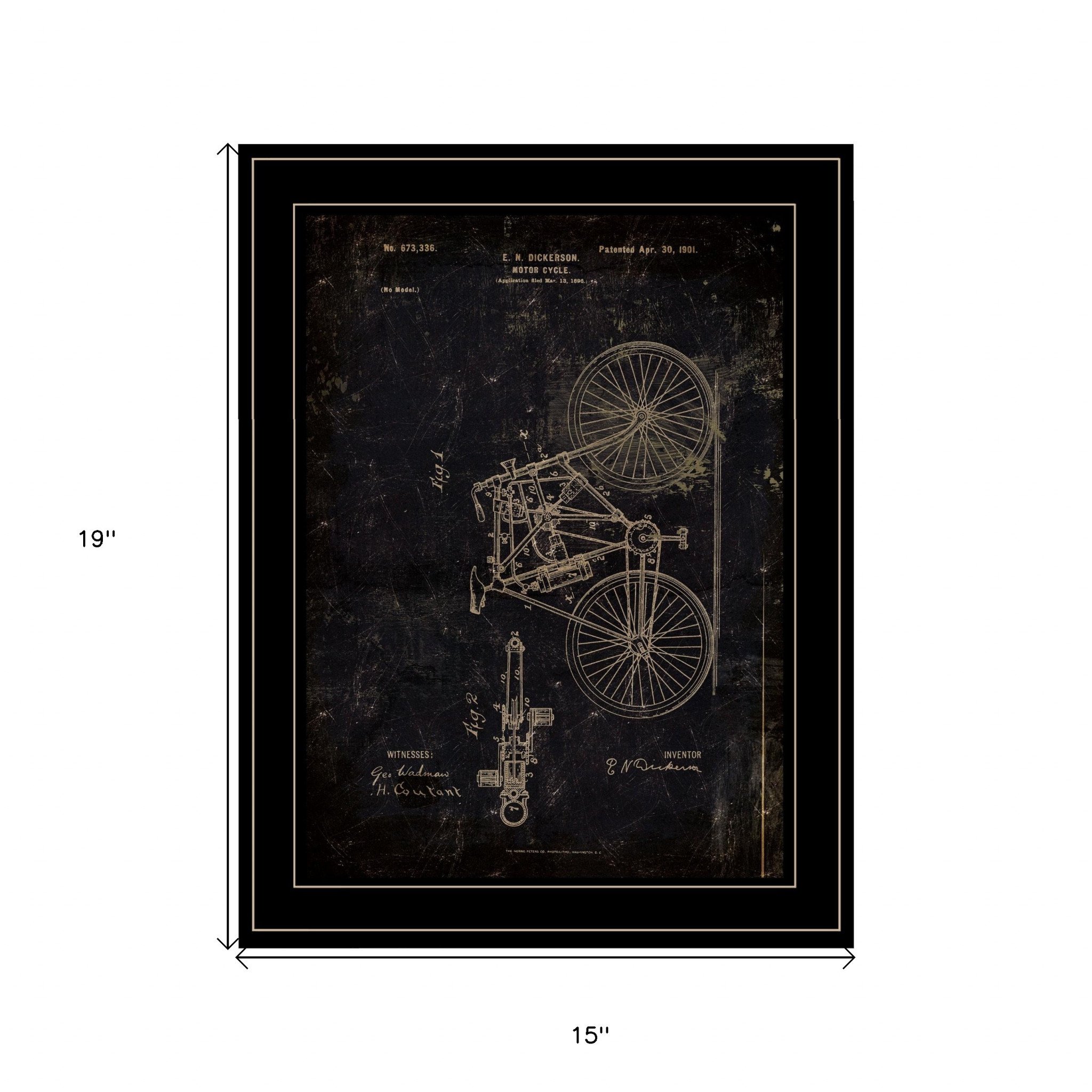 Add an air of fashion to your room and rejuvenate the space with this motor bike patent black framed print wall art. This transportation inspired wall art features a motor bike icon and will bring a refreshing look and perspective to your walls. This print is a visual artistic expression that allows you to decorate your space in style. Reproduced for you on paper, this hanging decorative accent will be a trendy and fashionable way to dress your walls. Hang on your wall to add some up to date fashion and decoration. Utilize this opportunity to create a focal point in the room with this fabulous wall decor option. 19-inch H x 15-inch W x 1-inch D