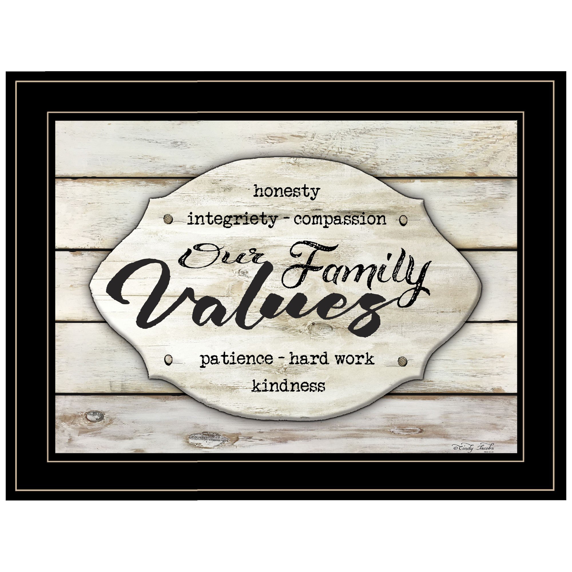 Unique and decorative, this our family values 3 black framed print wall art will leave a lasting impression. This print is a visual artistic expression that allows you to decorate your space in style. Reproduced for you on paper, this hanging decorative accent will be a trendy and fashionable way to dress your walls. Hang on your wall to add some up to date fashion and decoration. Instantly liven up your space with this art that brings color and dimension to your walls. 15-inch H x 19-inch W x 1-inch D