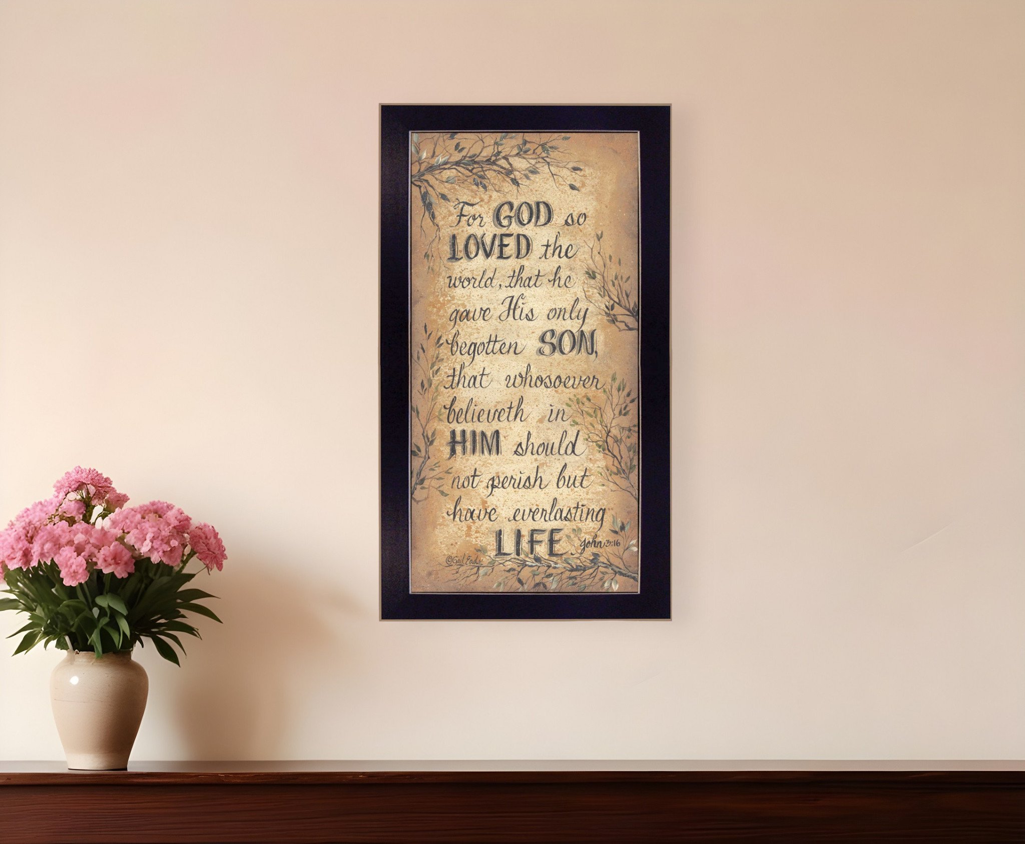 Unique and decorative, this for god so loved black framed print wall art will leave a lasting impression. This print is a visual artistic expression that allows you to decorate your space in style. Reproduced for you on paper, this hanging decorative accent will be a trendy and fashionable way to dress your walls. Hang on your wall to add some up to date fashion and decoration. Utilize this opportunity to create a focal point in the room with this fabulous wall decor option. 18-inch H x 10-inch W x 1-inch D
