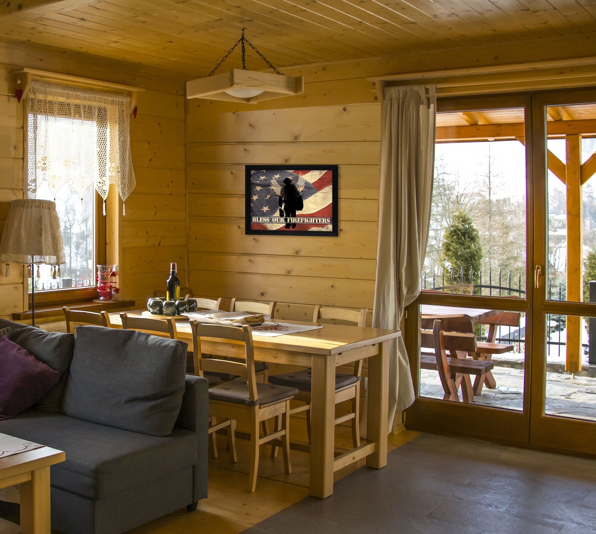 Add an air of fashion to your room and rejuvenate the space with this bless our firefighters black framed print wall art. This print is a visual artistic expression that allows you to decorate your space in style. Reproduced for you on paper, this hanging decorative accent will be a trendy and fashionable way to dress your walls. Adding this hanging wall art to your space to make your room feel more finished and attractive. Utilize this opportunity to create a focal point in the room with this fabulous wall decor option. 14-inch H x 18-inch W x 1-inch D