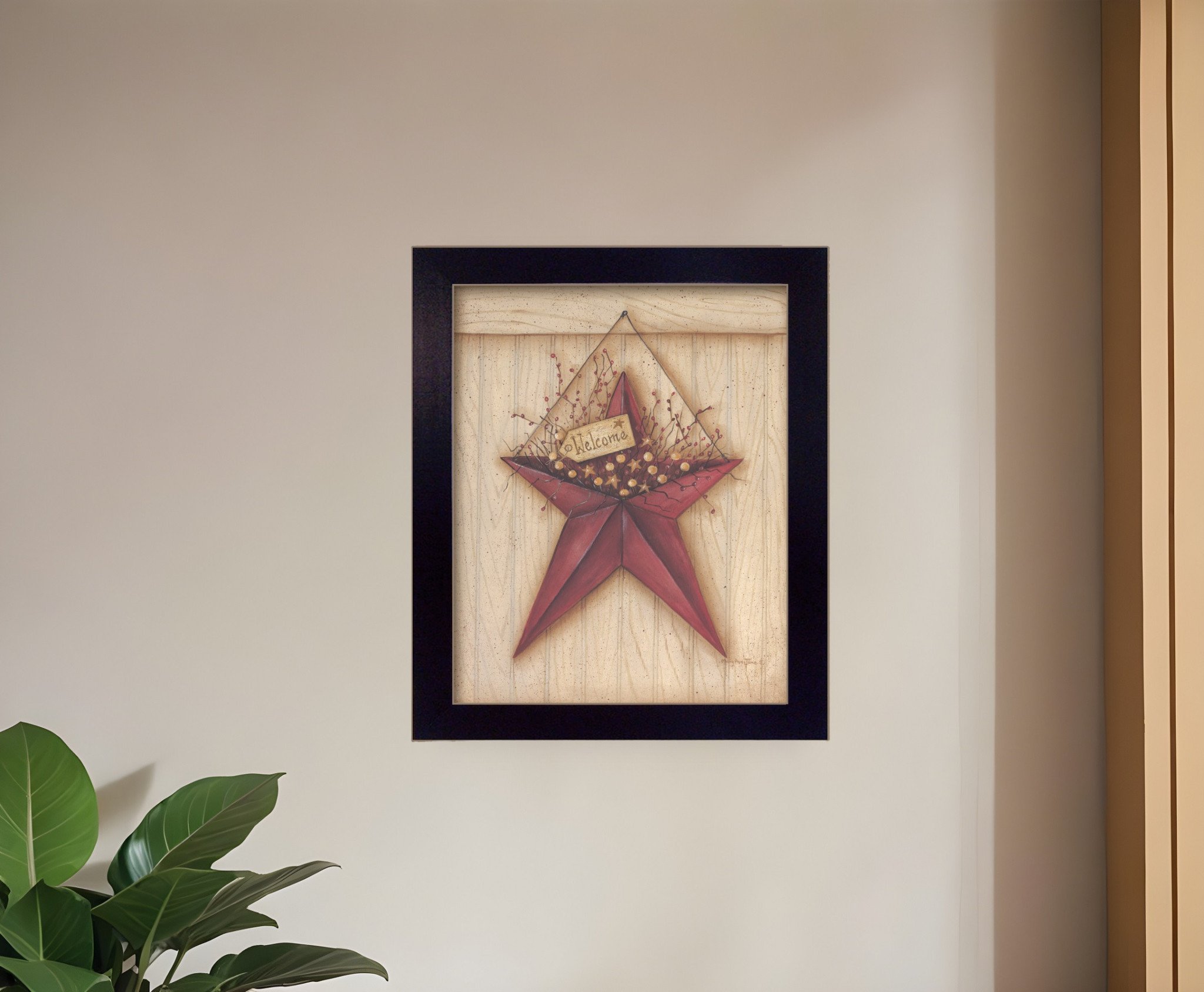 Unique and decorative, this welcome barn star 1 black framed print wall art will leave a lasting impression. This print is a visual artistic expression that allows you to decorate your space in style. Reproduced for you on paper, this hanging decorative accent will be a trendy and fashionable way to dress your walls. Adding this hanging wall art to your space to make your room feel more finished and attractive. Utilize this opportunity to create a focal point in the room with this fabulous wall decor option. 13-inch H x 16-inch W x 1-inch D