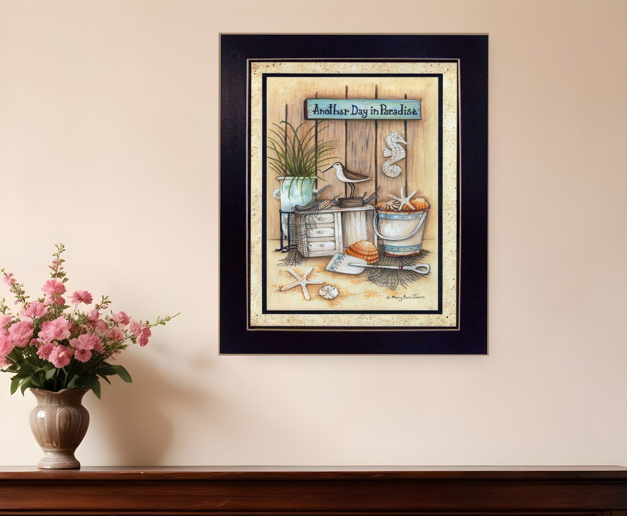 This another day in paradise 2 black framed print wall art will add a beautiful decorative accent to your decor. This print is a visual artistic expression that allows you to decorate your space in style. Reproduced for you on paper, this hanging decorative accent will be a trendy and fashionable way to dress your walls. Hang on your wall to add some up to date fashion and decoration. Utilize this opportunity to create a focal point in the room with this fabulous wall decor option. 20-inch H x 14-inch W x 1-inch D