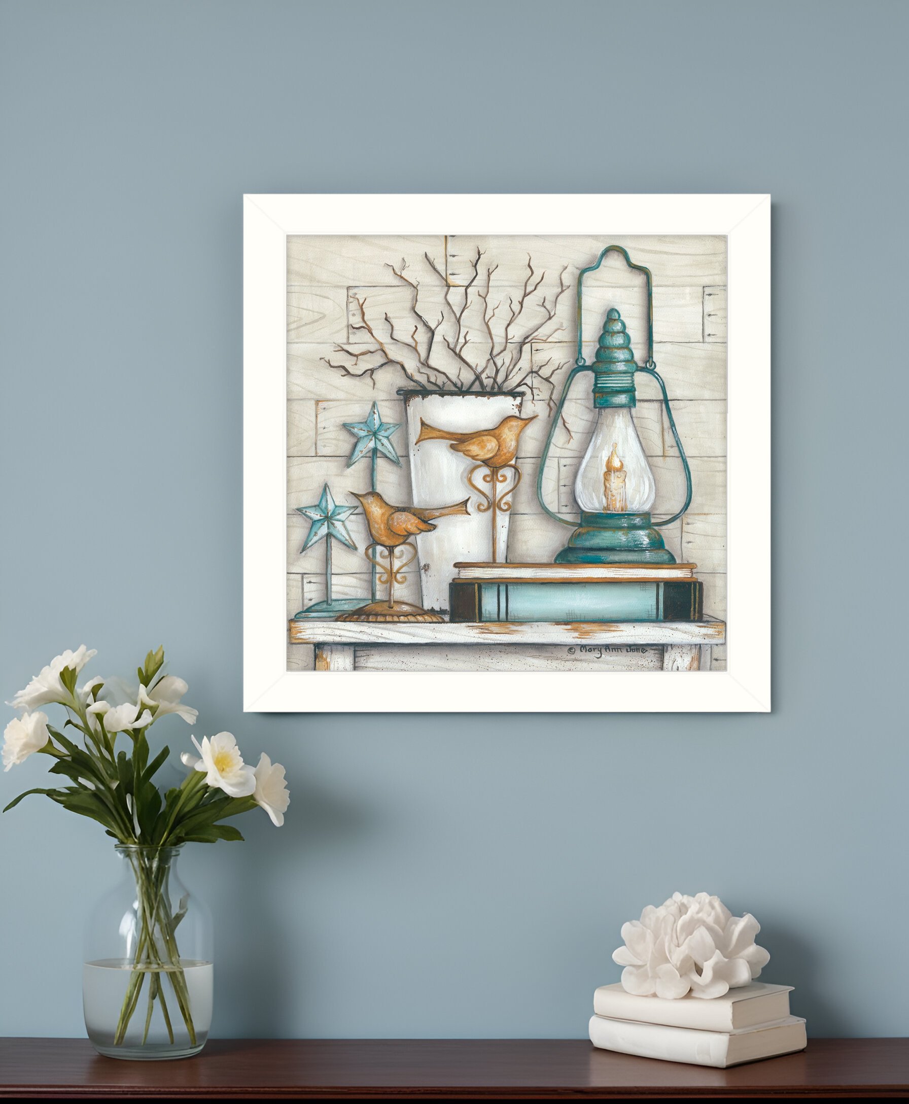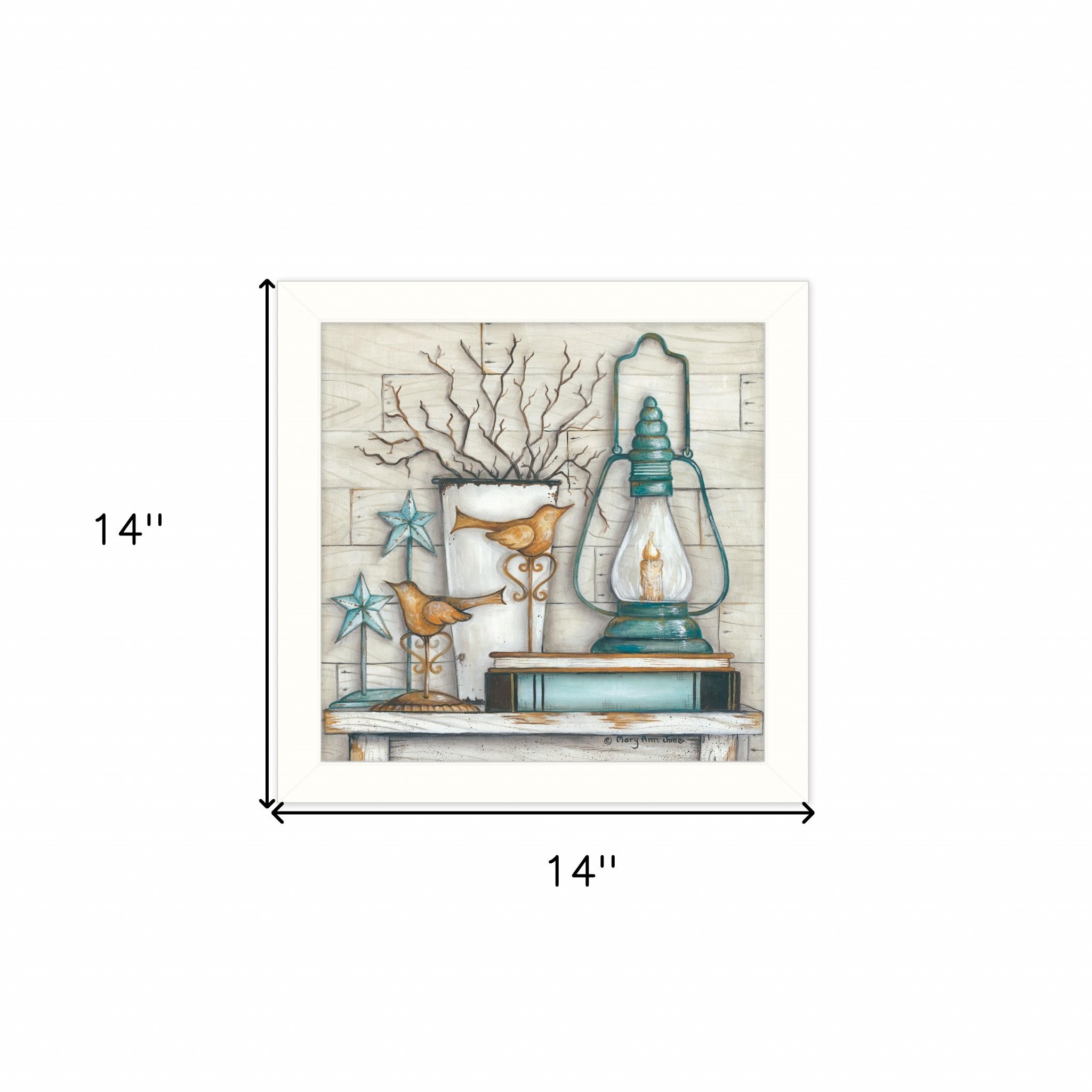 Bring some sizzle to your space with this eye-catching lantern on books 2 white framed print wall art. This print is a visual artistic expression that allows you to decorate your space in style. Reproduced for you on paper, this hanging decorative accent will be a trendy and fashionable way to dress your walls. Hang on your wall to add some up to date fashion and decoration. Instantly liven up your space with this art that brings color and dimension to your walls. 14-inch H x 14-inch W x 1-inch D