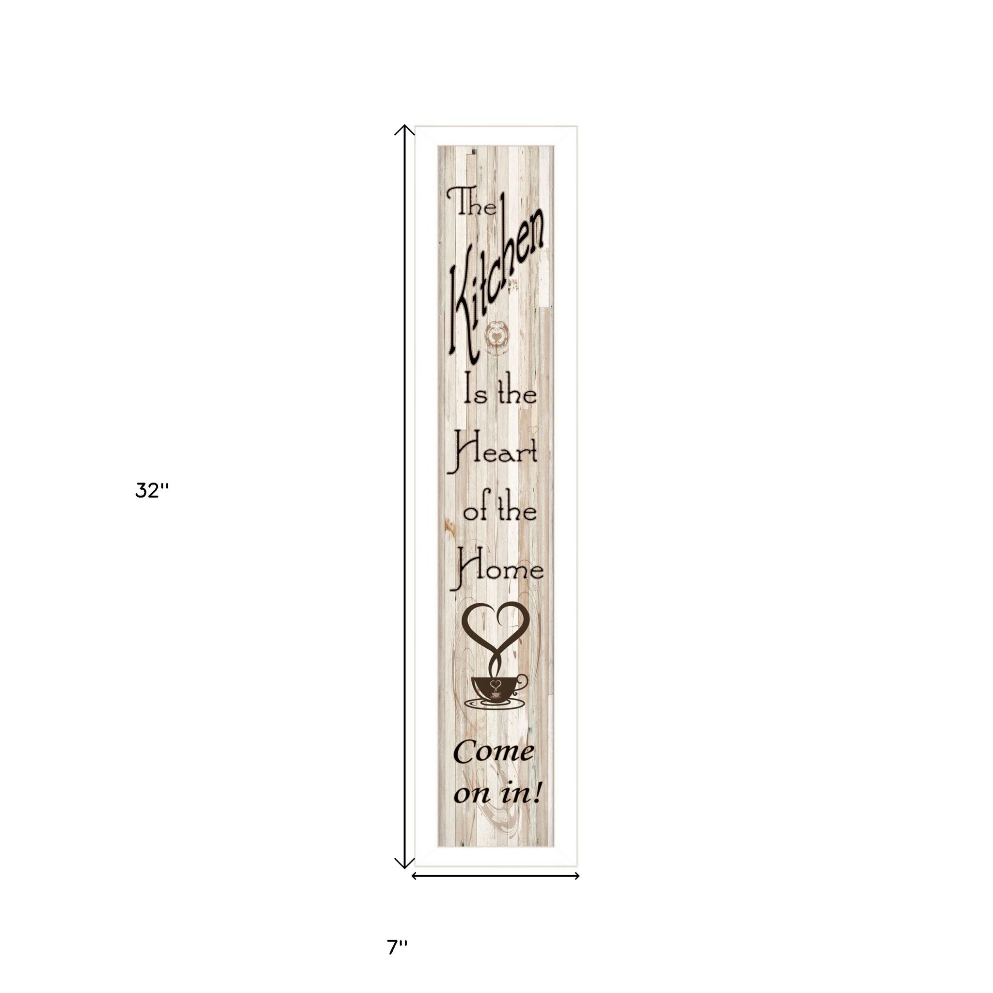 Add an air of fashion to your room and rejuvenate the space with this kitchen is the heart of the home 10 white framed print kitchen wall art. This print is a visual artistic expression that allows you to decorate your space in style. Reproduced for you on paper, this hanging decorative accent will be a trendy and fashionable way to dress your walls. Adding this hanging wall art to your space to make your room feel more finished and attractive. Instantly liven up your space with this art that brings color and dimension to your walls. 32-inch H x 7-inch W x 1-inch D