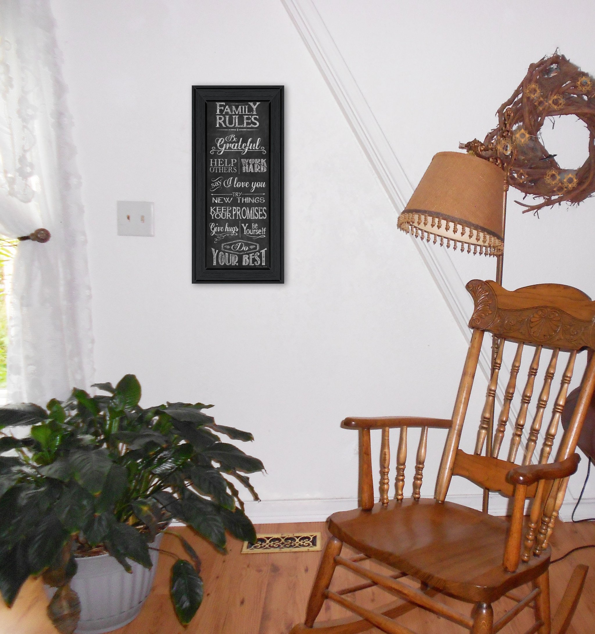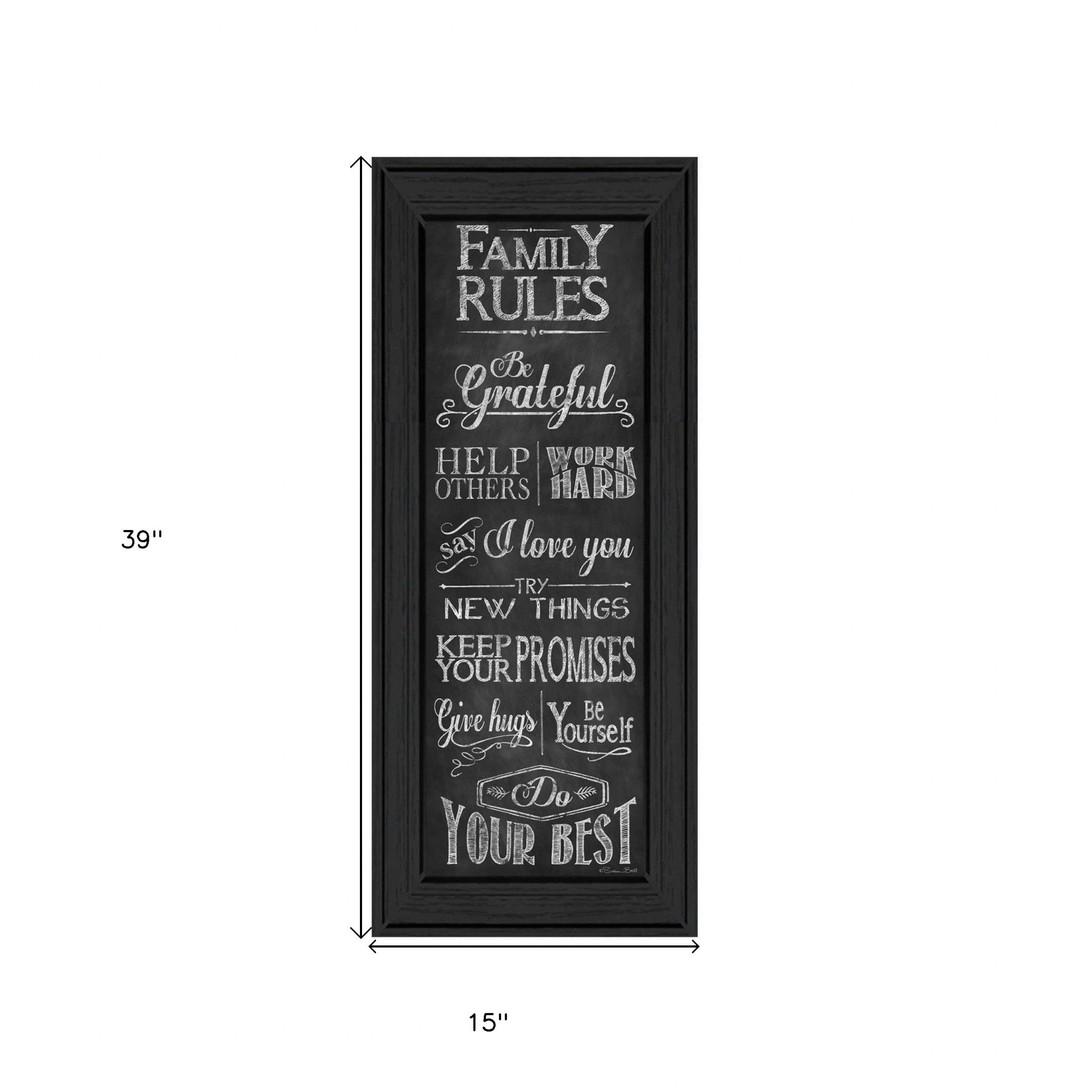 Add an air of fashion to your room and rejuvenate the space with this family rules 1 black framed print wall art. This print is a visual artistic expression that allows you to decorate your space in style. Reproduced for you on paper, this hanging decorative accent will be a trendy and fashionable way to dress your walls. Hang on your wall to add some up to date fashion and decoration. Utilize this opportunity to create a focal point in the room with this fabulous wall decor option. 39-inch H x 15-inch W x 1-inch D