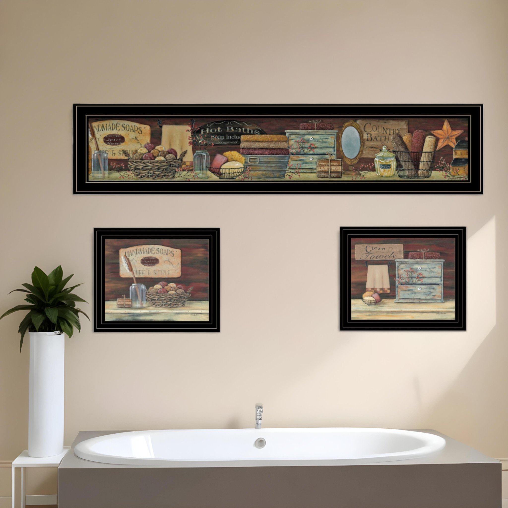 Unique and decorative, this set of three country bath 1 2 black framed print bathroom wall art will leave a lasting impression. This print is a visual artistic expression that allows you to decorate your space in style. Reproduced for you on paper, this hanging decorative accent will be a trendy and fashionable way to dress your walls. Hang on your wall to add some up to date fashion and decoration. Instantly liven up your space with this art that brings color and dimension to your walls. 14-inch H x 39-inch W x 1-inch D