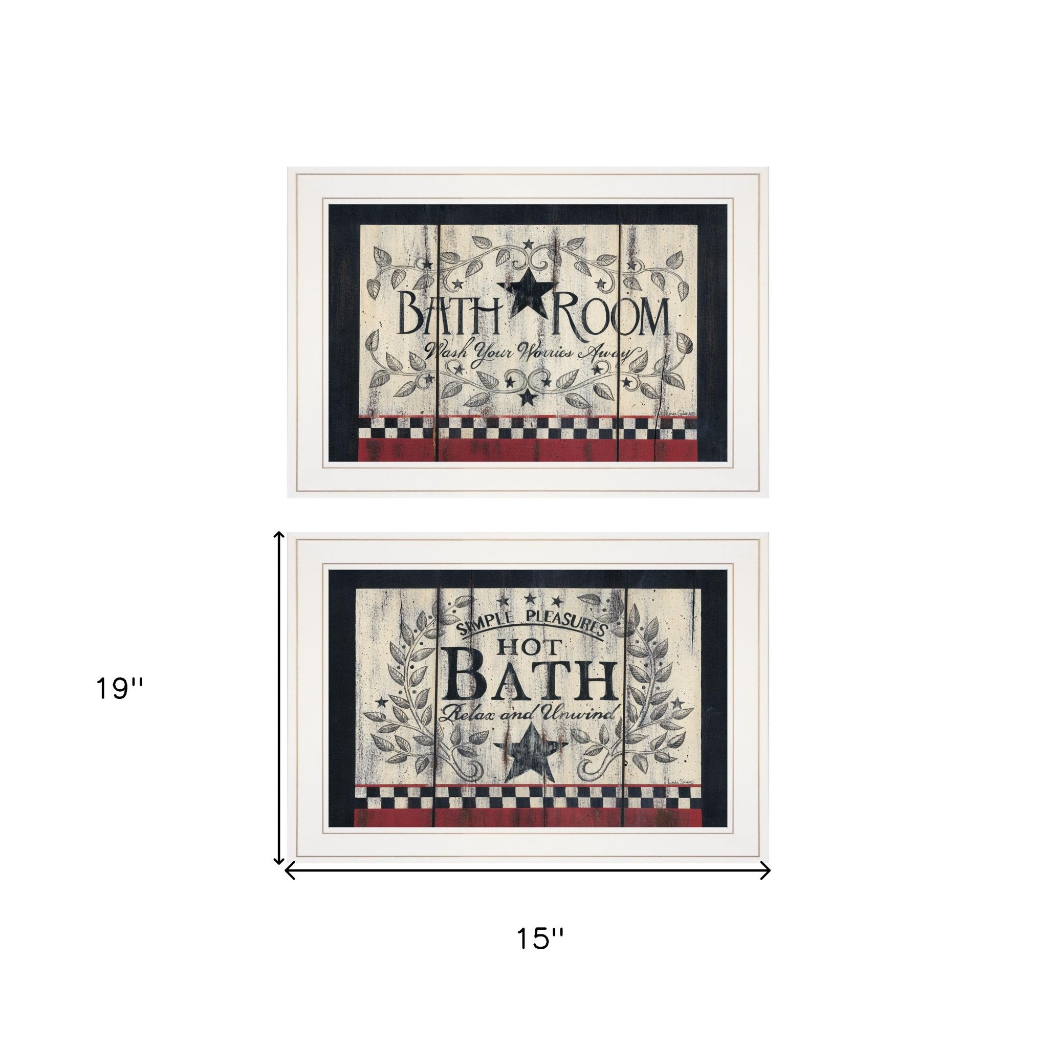 Add an air of fashion to your room and rejuvenate the space with this set of two hot bath 6 white framed print bathroom wall art. This print is a visual artistic expression that allows you to decorate your space in style. Reproduced for you on paper, this hanging decorative accent will be a trendy and fashionable way to dress your walls. Hang on your wall to add some up to date fashion and decoration. Utilize this opportunity to create a focal point in the room with this fabulous wall decor option. 15-inch H x 19-inch W x 1-inch D
