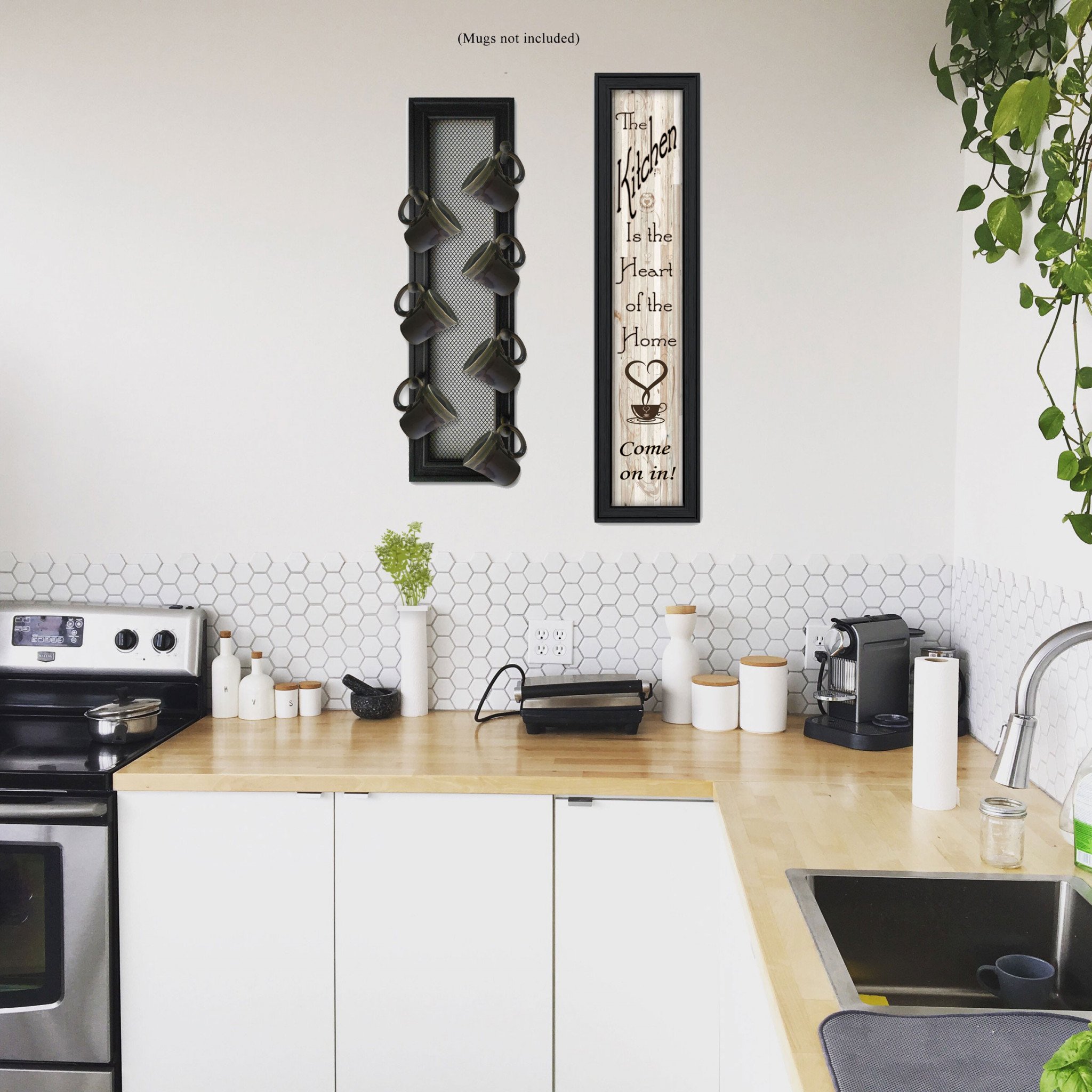 The set of two come on in with seven peg mug rack 1 black framed print kitchen wall art is the perfect decorative accessory for your home. This print is a visual artistic expression that allows you to decorate your space in style. Reproduced for you on paper, this hanging decorative accent will be a trendy and fashionable way to dress your walls. Hang on your wall to add some up to date fashion and decoration. Utilize this opportunity to create a focal point in the room with this fabulous wall decor option. 32-inch H x 7-inch W x 3-inch D