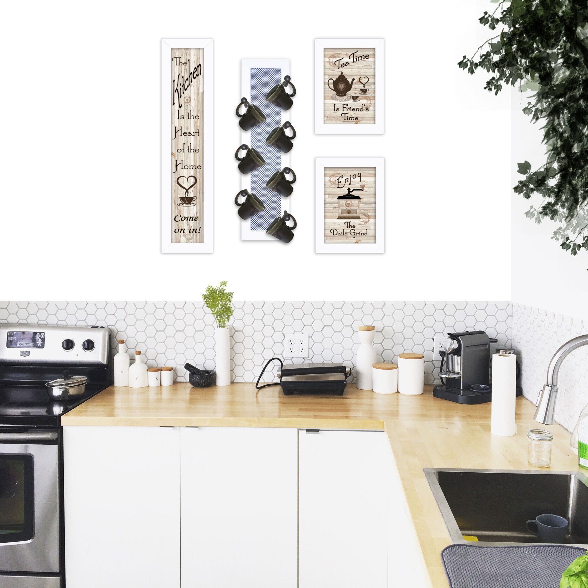 Add an air of fashion to your room and rejuvenate the space with this set of four kitchen collection v with seven peg mug rack 4 white framed print kitchen wall art. This print is a visual artistic expression that allows you to decorate your space in style. Reproduced for you on paper, this hanging decorative accent will be a trendy and fashionable way to dress your walls. Adding this hanging wall art to your space to make your room feel more finished and attractive. Utilize this opportunity to create a focal point in the room with this fabulous wall decor option. 10-inch H x 32-inch W x 3-inch D