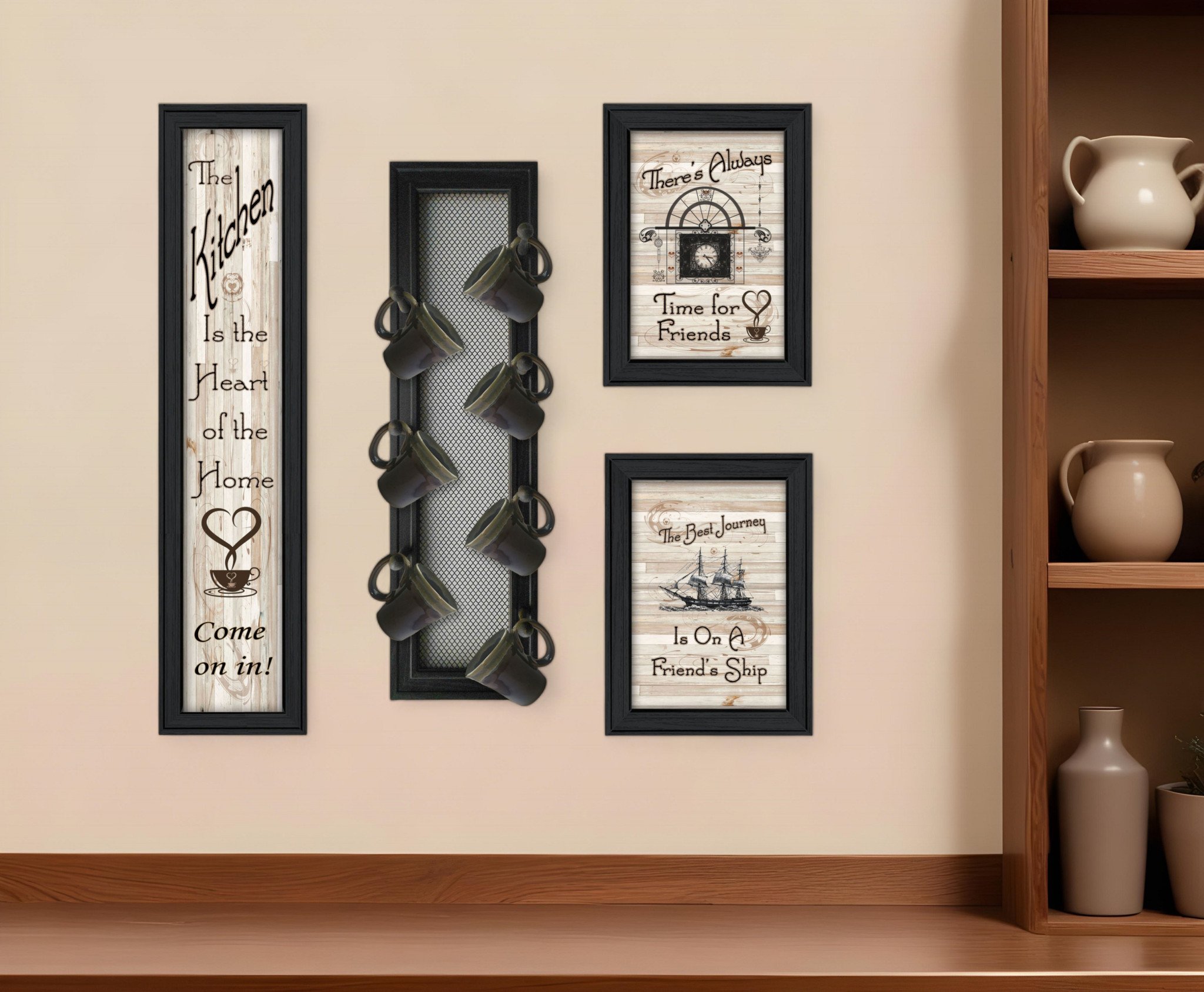 Set Of Four Kitchen Collection VII with Seven Peg Mug Rack 2 Black Framed Print Kitchen Wall Art