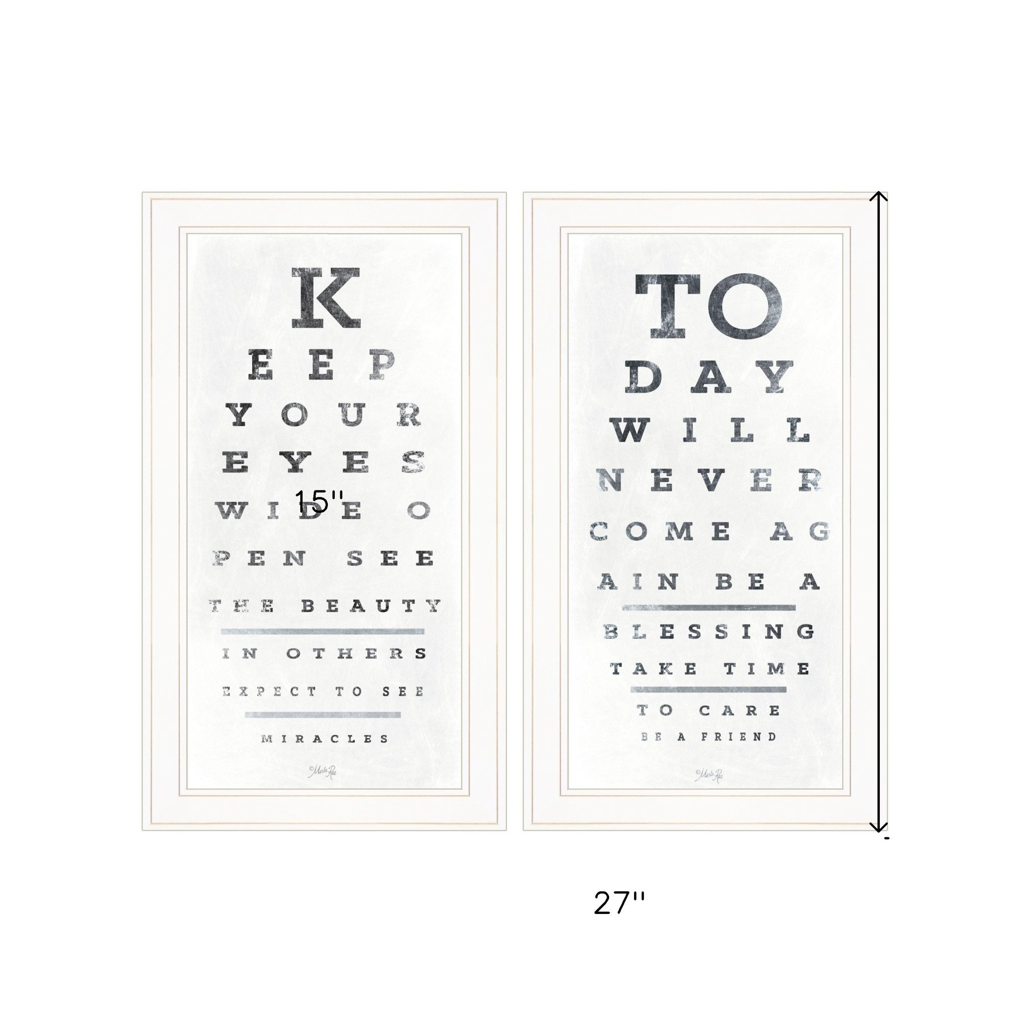 Unique and decorative, this set of two eye charts 3 white framed print wall art will leave a lasting impression. This print is a visual artistic expression that allows you to decorate your space in style. Reproduced for you on paper, this hanging decorative accent will be a trendy and fashionable way to dress your walls. Hang on your wall to add some up to date fashion and decoration. Instantly liven up your space with this art that brings color and dimension to your walls. 27-inch H x 15-inch W x 1-inch D