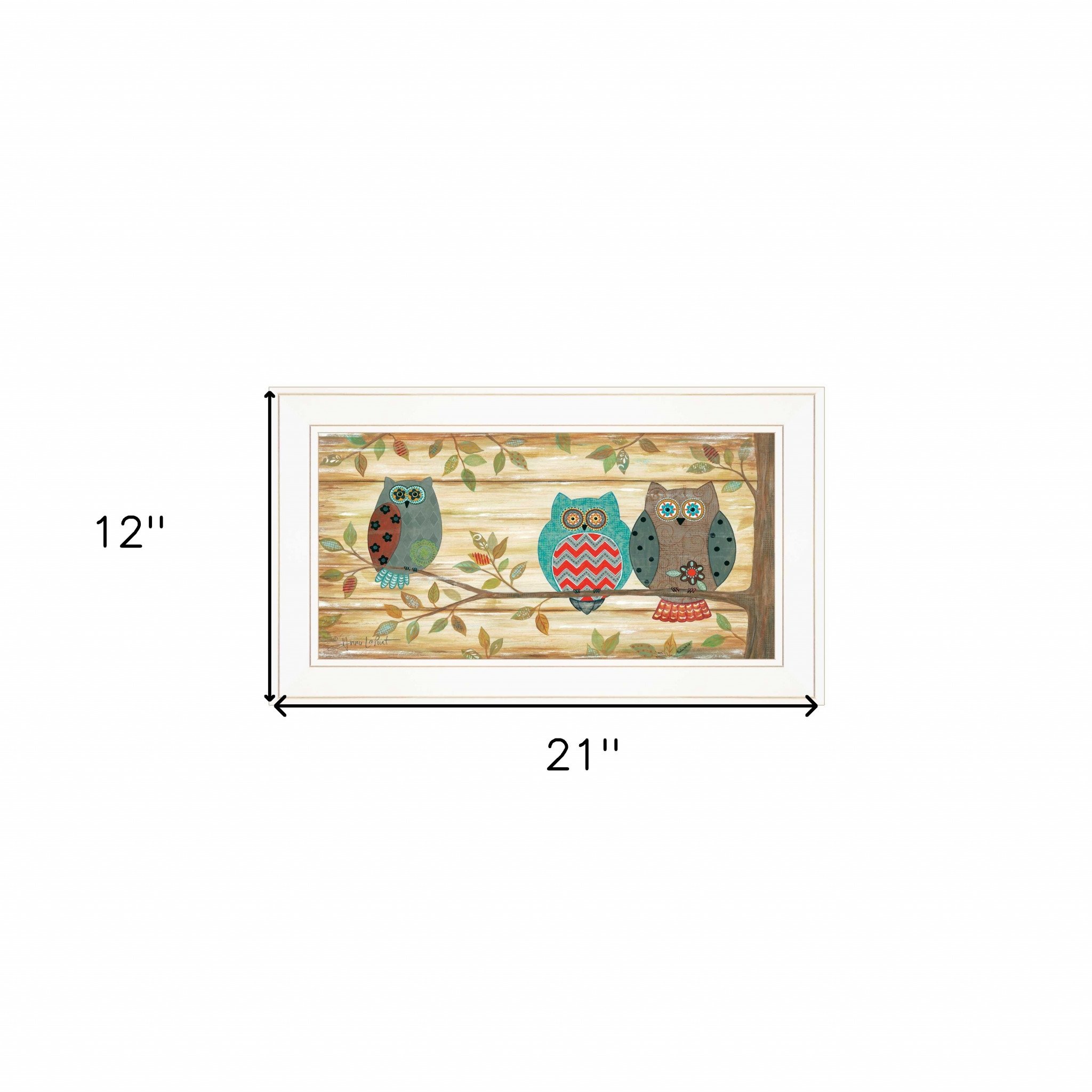 This three wise owls 2 white framed print wall art will add a beautiful decorative accent to your decor. Add a sense of the woods, mountain or lodge lifestyle to your walls with this outdoorsy owl wall art. This print is a visual artistic expression that allows you to decorate your space in style. Reproduced for you on paper, this hanging decorative accent will be a trendy and fashionable way to dress your walls. Hang on your wall to add some up to date fashion and decoration. Instantly liven up your space with this art that brings color and dimension to your walls. 12-inch H x 21-inch W x 1-inch D