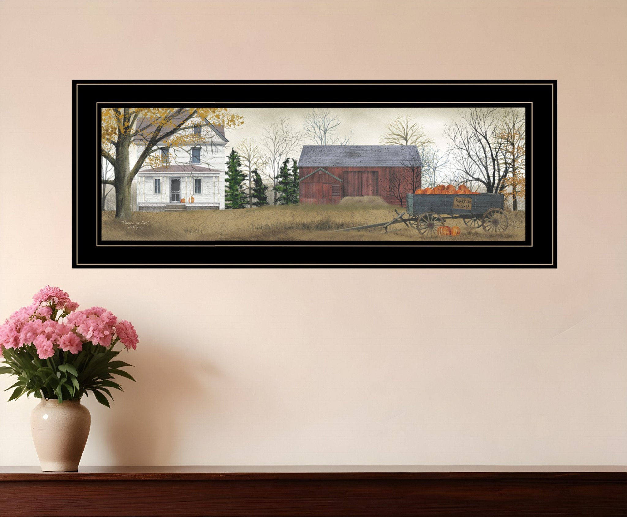 Add an air of fashion to your room and rejuvenate the space with this pumpkins for sale 3 black framed print wall art. This print is a visual artistic expression that allows you to decorate your space in style. Reproduced for you on paper, this hanging decorative accent will be a trendy and fashionable way to dress your walls. Hang on your wall to add some up to date fashion and decoration. Utilize this opportunity to create a focal point in the room with this fabulous wall decor option. 9-inch H x 21-inch W x 1-inch D