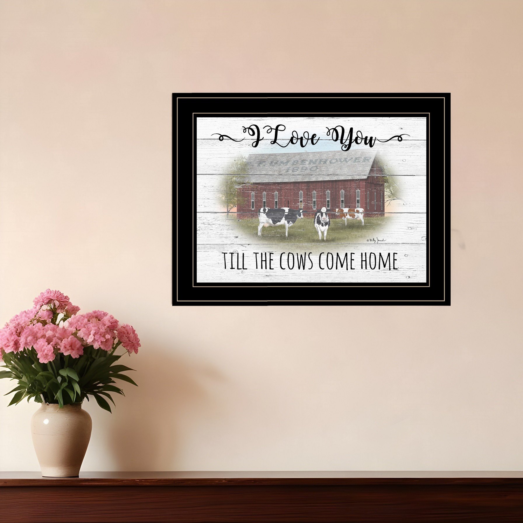 Unique and decorative, this i love you till the cows come home 2 black framed print wall art will leave a lasting impression. This print is a visual artistic expression that allows you to decorate your space in style. Reproduced for you on paper, this hanging decorative accent will be a trendy and fashionable way to dress your walls. Adding this hanging wall art to your space to make your room feel more finished and attractive. Utilize this opportunity to create a focal point in the room with this fabulous wall decor option. 15-inch H x 19-inch W x 1-inch D