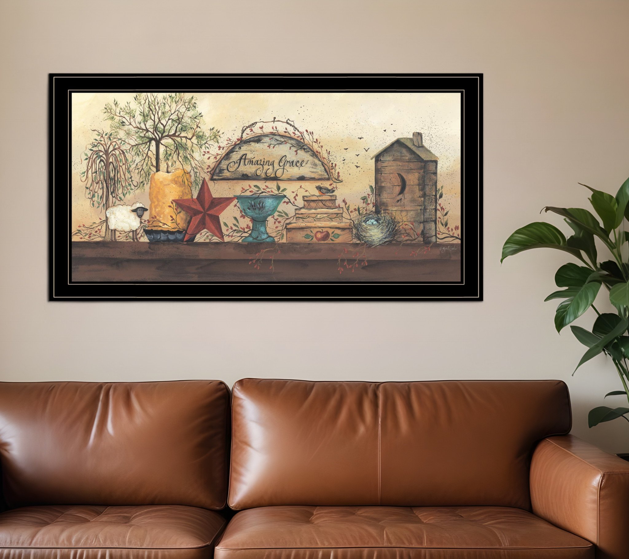 The amazing grace shelf 2 black framed print wall art is the perfect decorative accessory for your home. This print is a visual artistic expression that allows you to decorate your space in style. Reproduced for you on paper, this hanging decorative accent will be a trendy and fashionable way to dress your walls. Adding this hanging wall art to your space to make your room feel more finished and attractive. Instantly liven up your space with this art that brings color and dimension to your walls. 19-inch H x 37-inch W x 1-inch D
