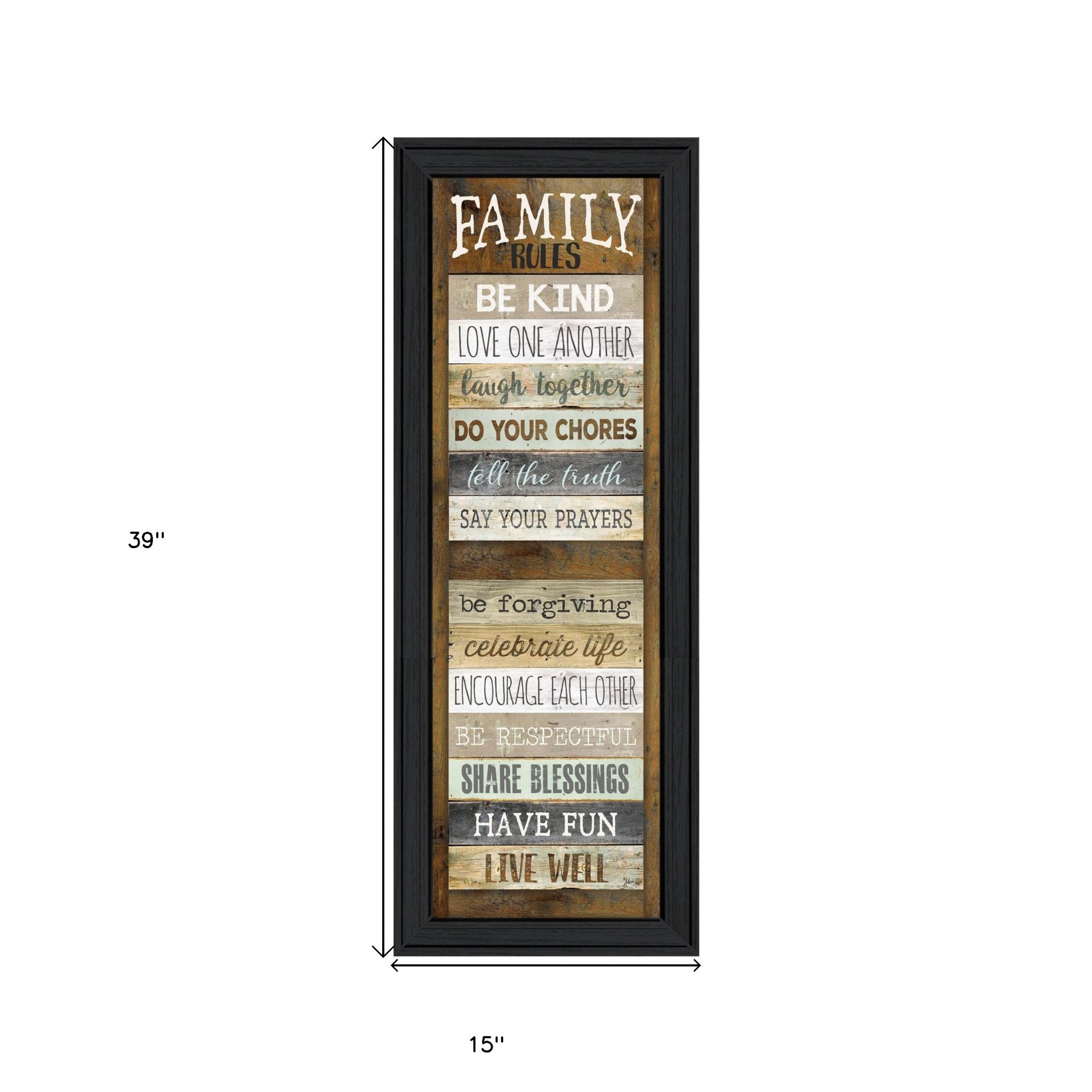 Unique and decorative, this family rules shutter 3 black framed print wall art will leave a lasting impression. This print is a visual artistic expression that allows you to decorate your space in style. Reproduced for you on paper, this hanging decorative accent will be a trendy and fashionable way to dress your walls. Adding this hanging wall art to your space to make your room feel more finished and attractive. Utilize this opportunity to create a focal point in the room with this fabulous wall decor option. 39-inch H x 15-inch W x 1-inch D