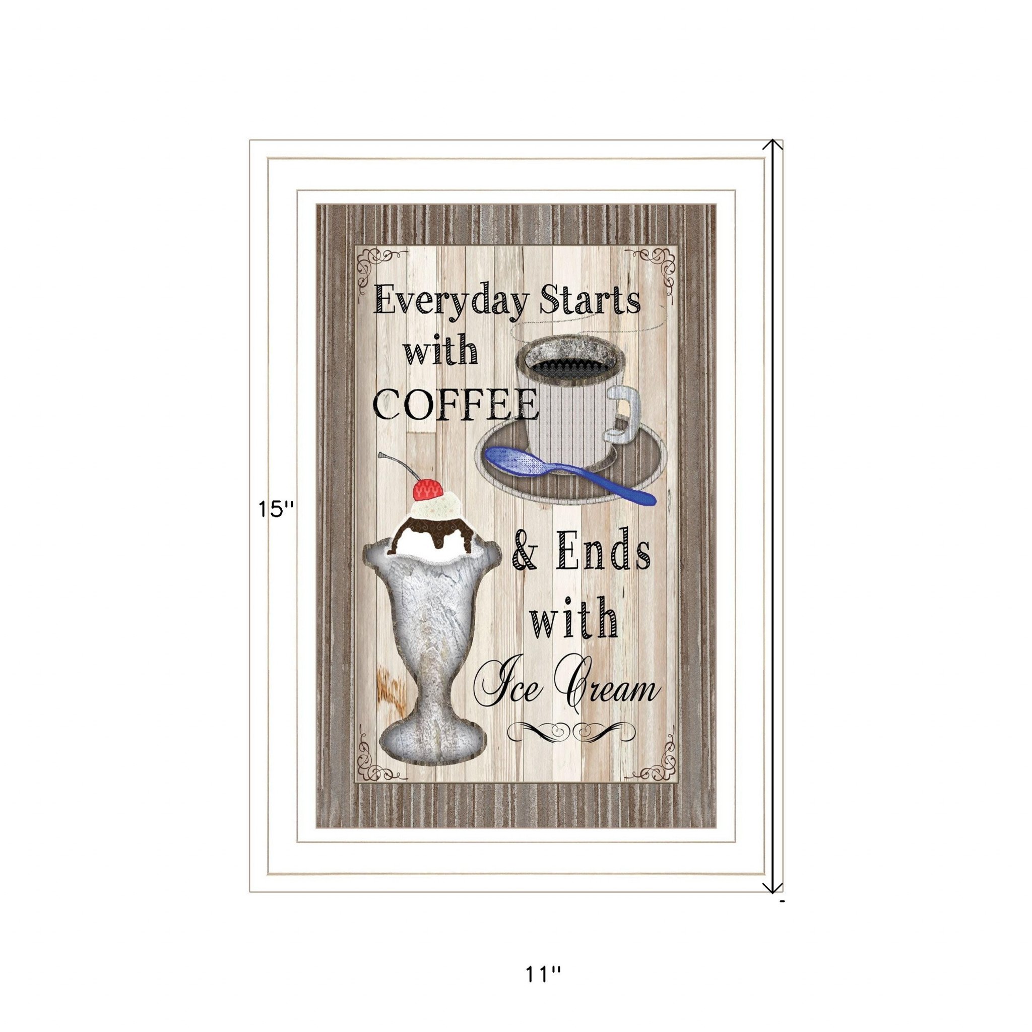 Bring some sizzle to your space with this eye-catching everyday starts with coffee 1 white framed print wall art. This print is a visual artistic expression that allows you to decorate your space in style. Reproduced for you on paper, this hanging decorative accent will be a trendy and fashionable way to dress your walls. Hang on your wall to add some up to date fashion and decoration. Utilize this opportunity to create a focal point in the room with this fabulous wall decor option. 15-inch H x 11-inch W x 1-inch D