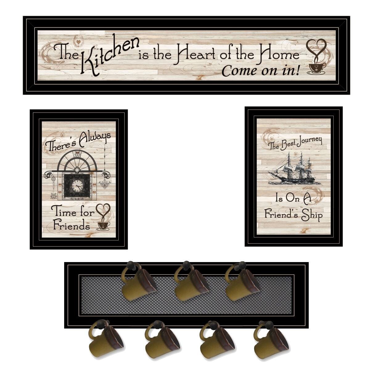 The set of four kitchen prints and mug rack is the perfect decorative accessory for your home. This set includes three framed prints and a pegged rack for mugs, keys, towels, or anything else you might want to hang from it. This hanging decorative set accent will be a trendy and fashionable way to dress your walls. Utilize this opportunity to create a focal point in the room with these fabulous wall decor options.