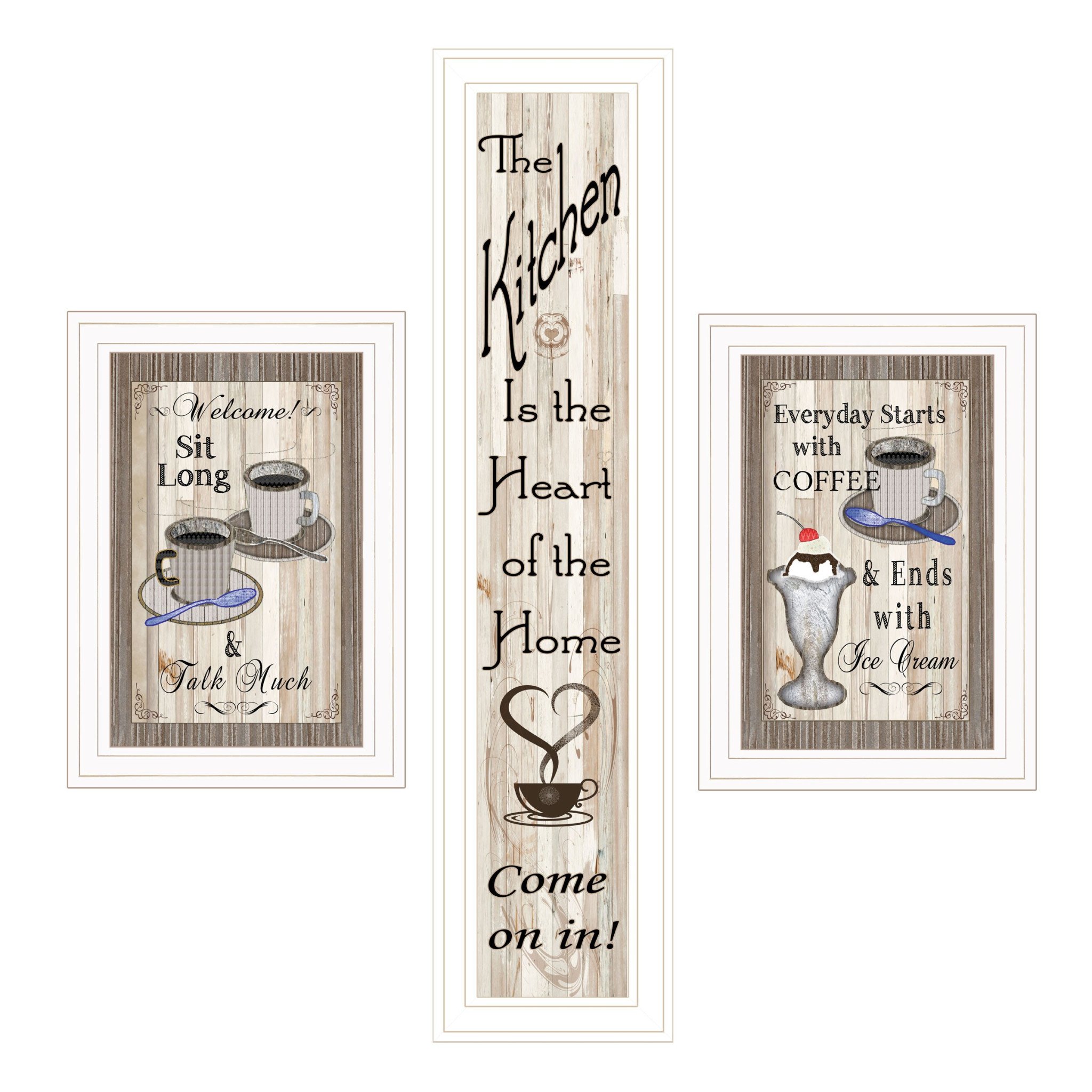 The set of three come on in white framed print kitchen wall art is the perfect decorative accessory for your home. This print is a visual artistic expression that allows you to decorate your space in style. Reproduced for you on paper, this hanging decorative accent will be a trendy and fashionable way to dress your walls. Hang on your wall to add some up to date fashion and decoration. Utilize this opportunity to create a focal point in the room with this fabulous wall decor option. 33-inch H x 11-inch W x 1-inch D