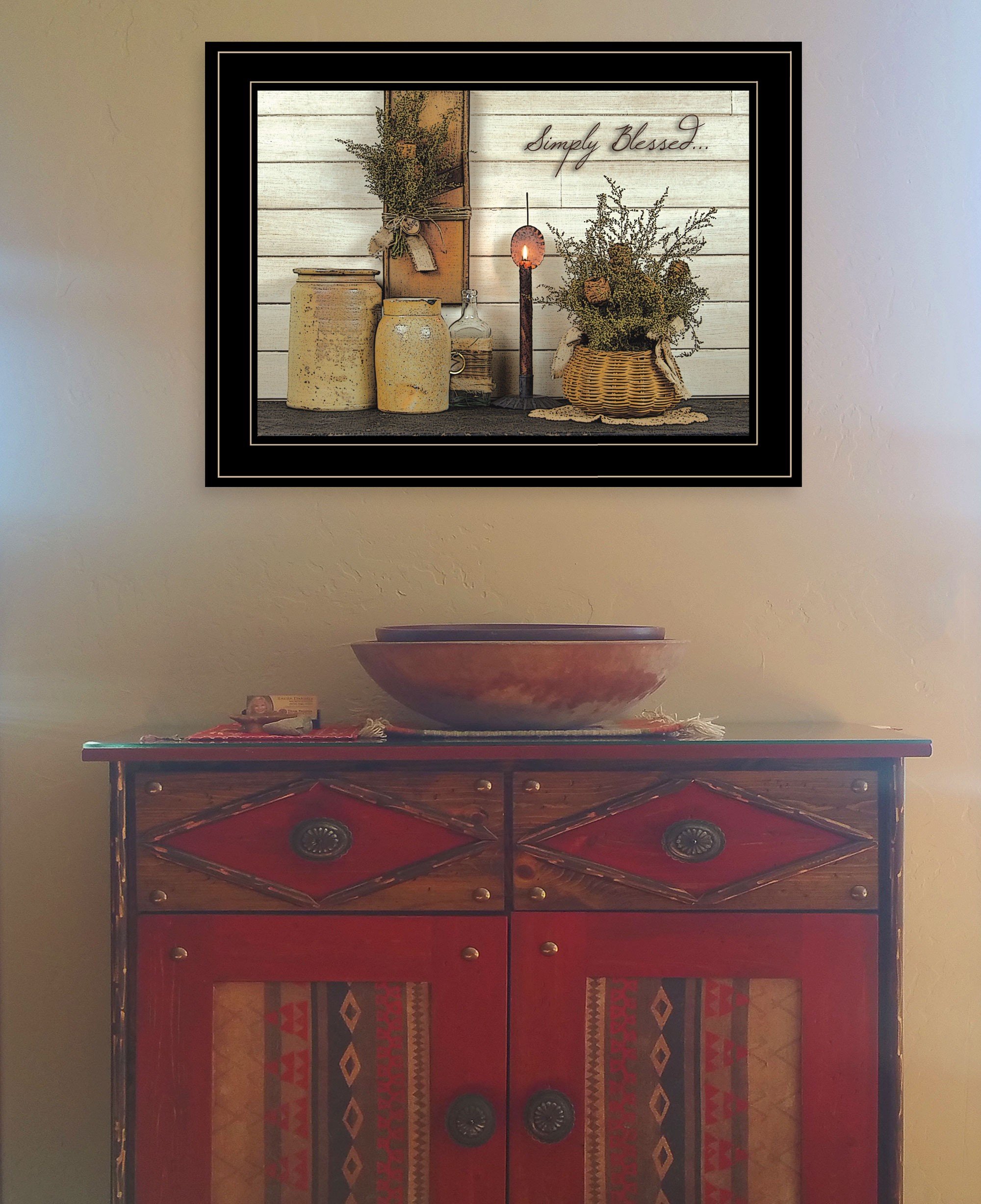 The simply blessed black framed print kitchen wall art is the perfect decorative accessory for your home. This print is a visual artistic expression that allows you to decorate your space in style. Reproduced for you on paper, this hanging decorative accent will be a trendy and fashionable way to dress your walls. Adding this hanging wall art to your space to make your room feel more finished and attractive. Utilize this opportunity to create a focal point in the room with this fabulous wall decor option. 15-inch H x 19-inch W x 1-inch D