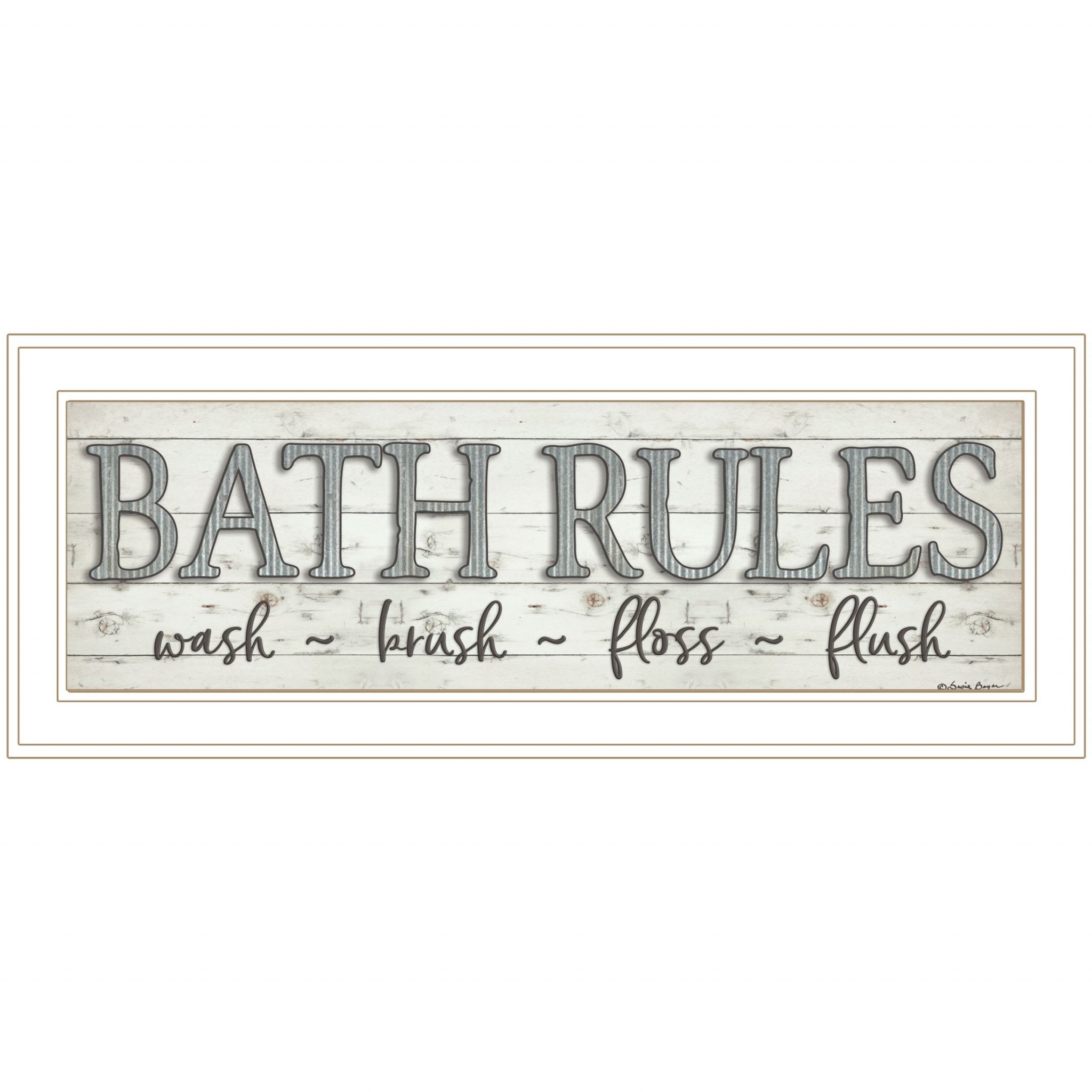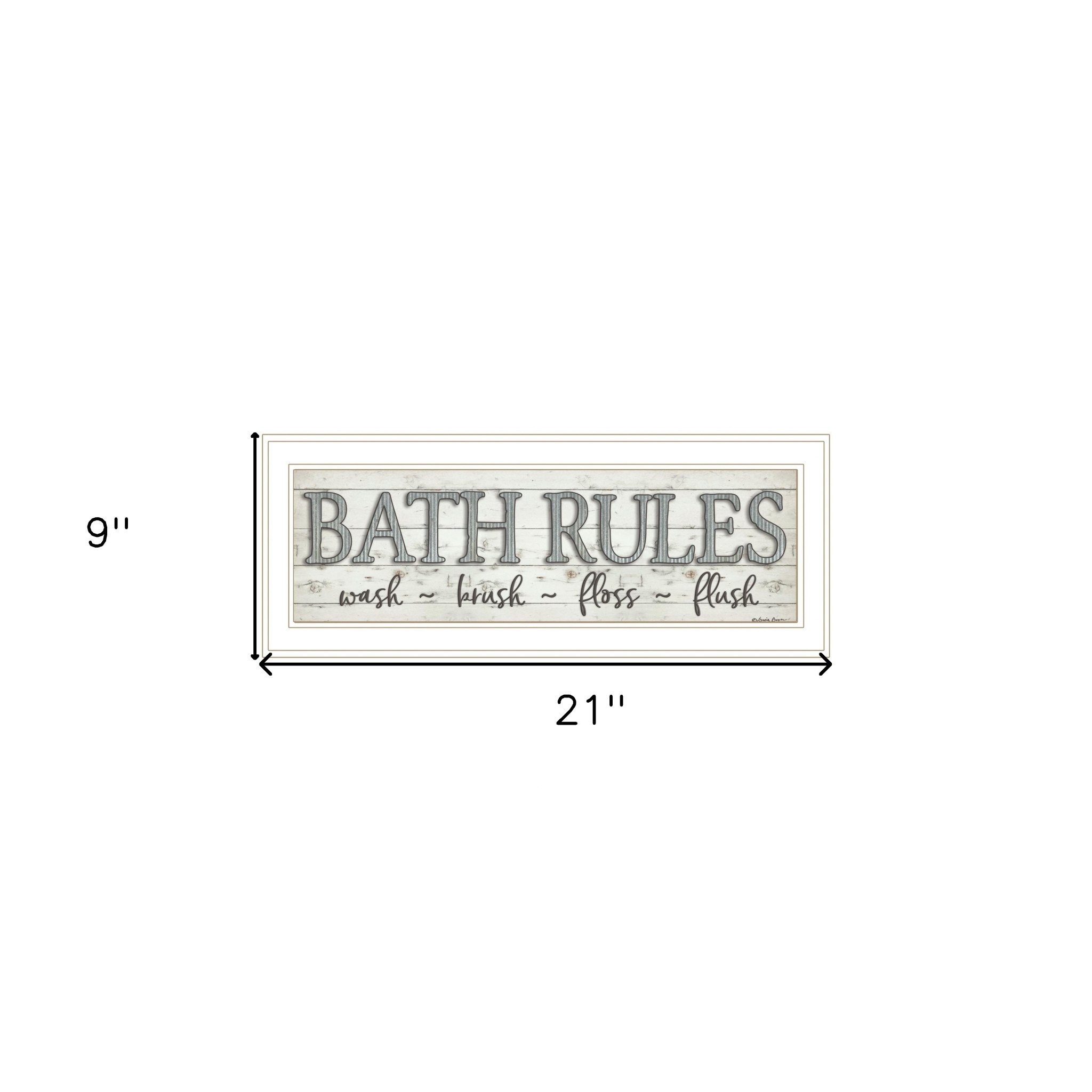 Bring some sizzle to your space with this eye-catching bath rules 1 white framed print bathroom wall art. This print is a visual artistic expression that allows you to decorate your space in style. Reproduced for you on paper, this hanging decorative accent will be a trendy and fashionable way to dress your walls. Hang on your wall to add some up to date fashion and decoration. Utilize this opportunity to create a focal point in the room with this fabulous wall decor option. 9-inch H x 21-inch W x 1-inch D
