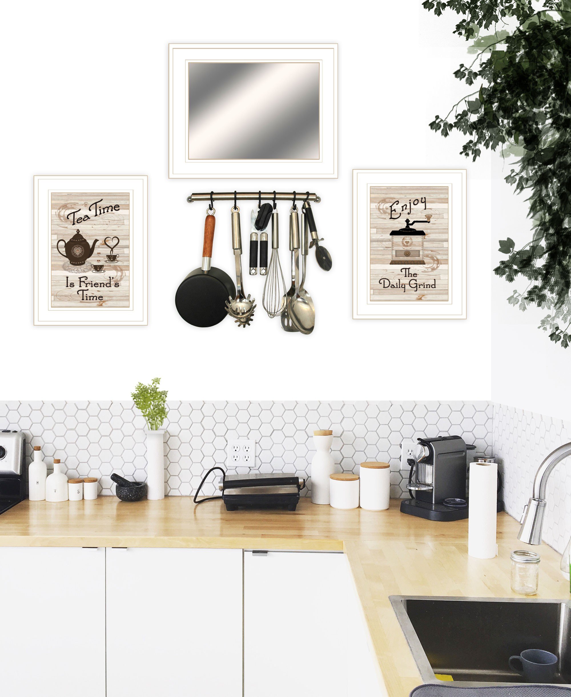 Bring some sizzle to your space with this eye-catching set of three tea and coffee time white framed print kitchen wall art. Unique and decorative, this set of three white framed kitchen wall art will leave a lasting impression. This set is a visual artistic expression that allows you to decorate your space in style. Reproduced for you on paper the prints are a trendy and fashionable way to dress your walls. In addition to the cute kitchen wall art, this set includes an accent mirror. 12-inch H x 15-inch W x 1-inch D