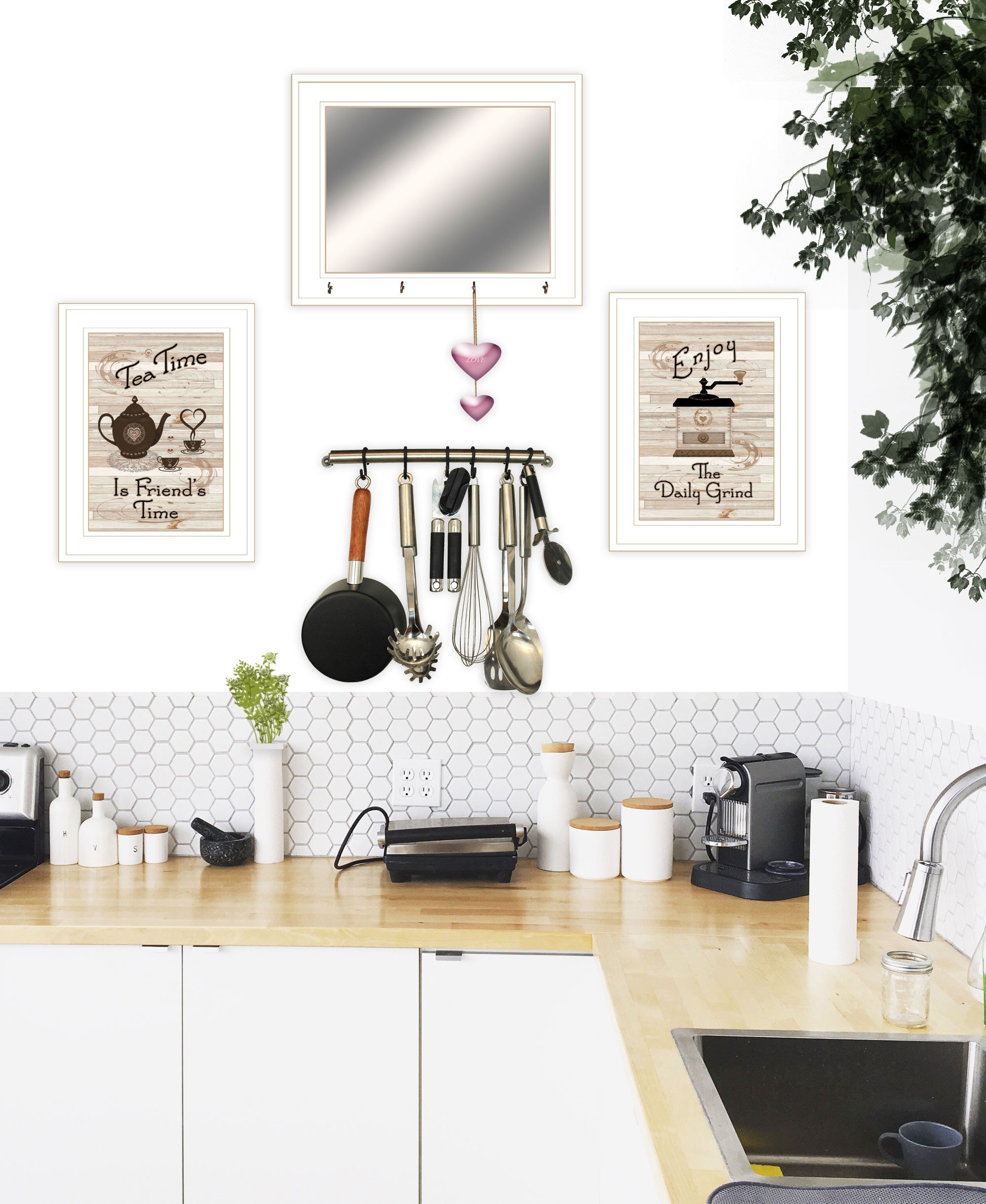 Home > Set Of Three Coffee And Tea White Framed Kitchen Wall Art With Mirror And Hooks