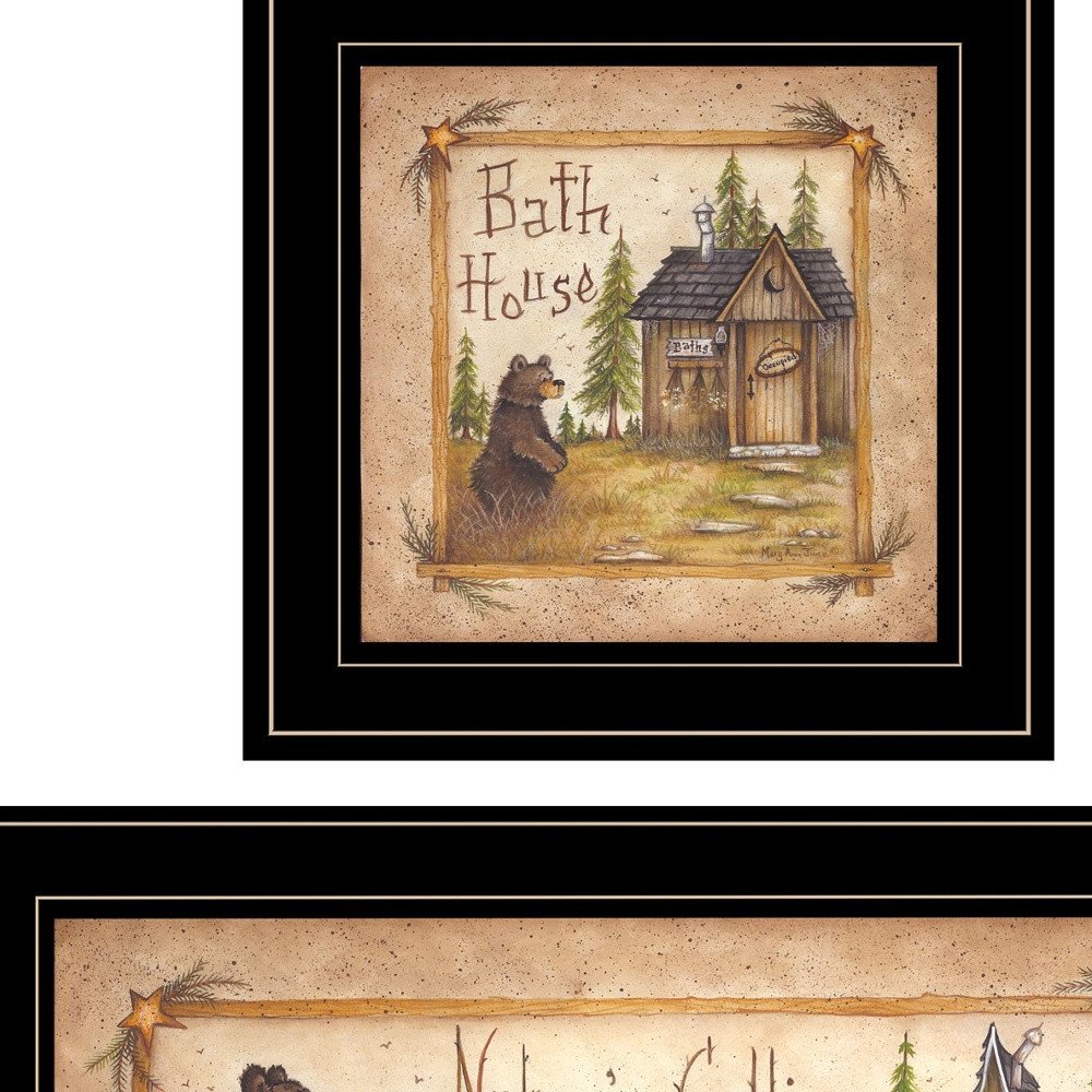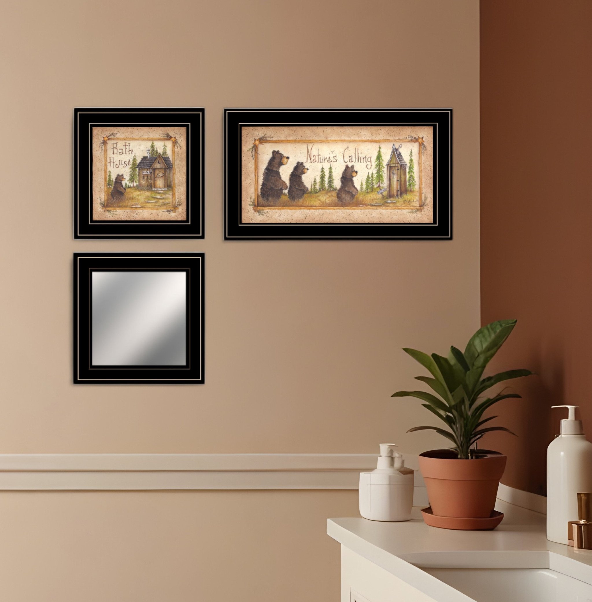 Bring some sizzle to your space with this eye-catching set of three natures calling black framed print bathroom wall art. Add a sense of the woods, mountain or lodge lifestyle to your walls with this cute outdoorsy bear wall art. Unique and decorative, this set of three will leave a lasting impression. This set is a visual artistic expression that allows you to decorate your space in style. Reproduced for you on paper the prints are a trendy and fashionable way to dress your walls. In addition to the whimsical bathroom wall art, this set includes an accent mirror. 15-inch H x 19-inch W x 1-inch D