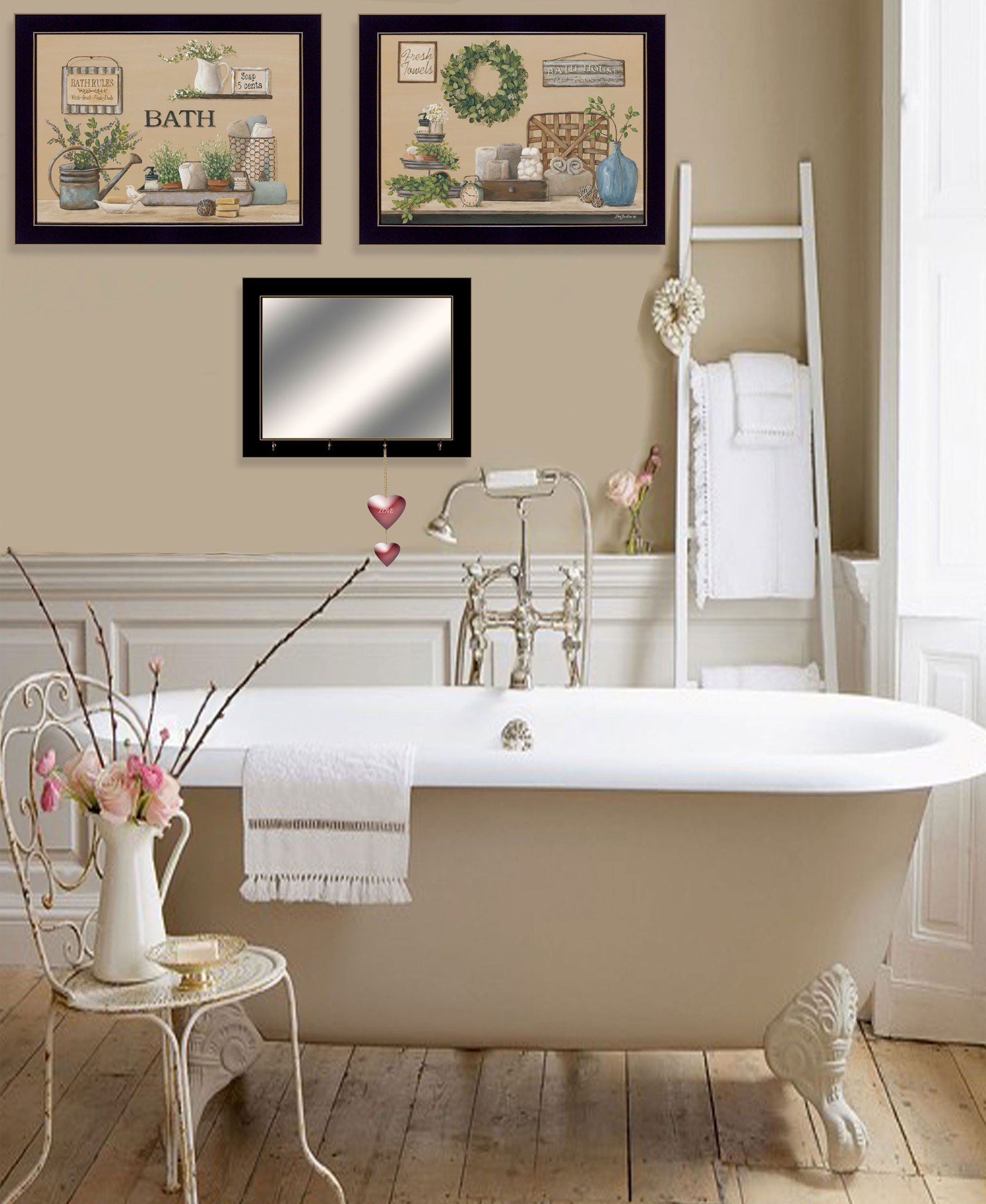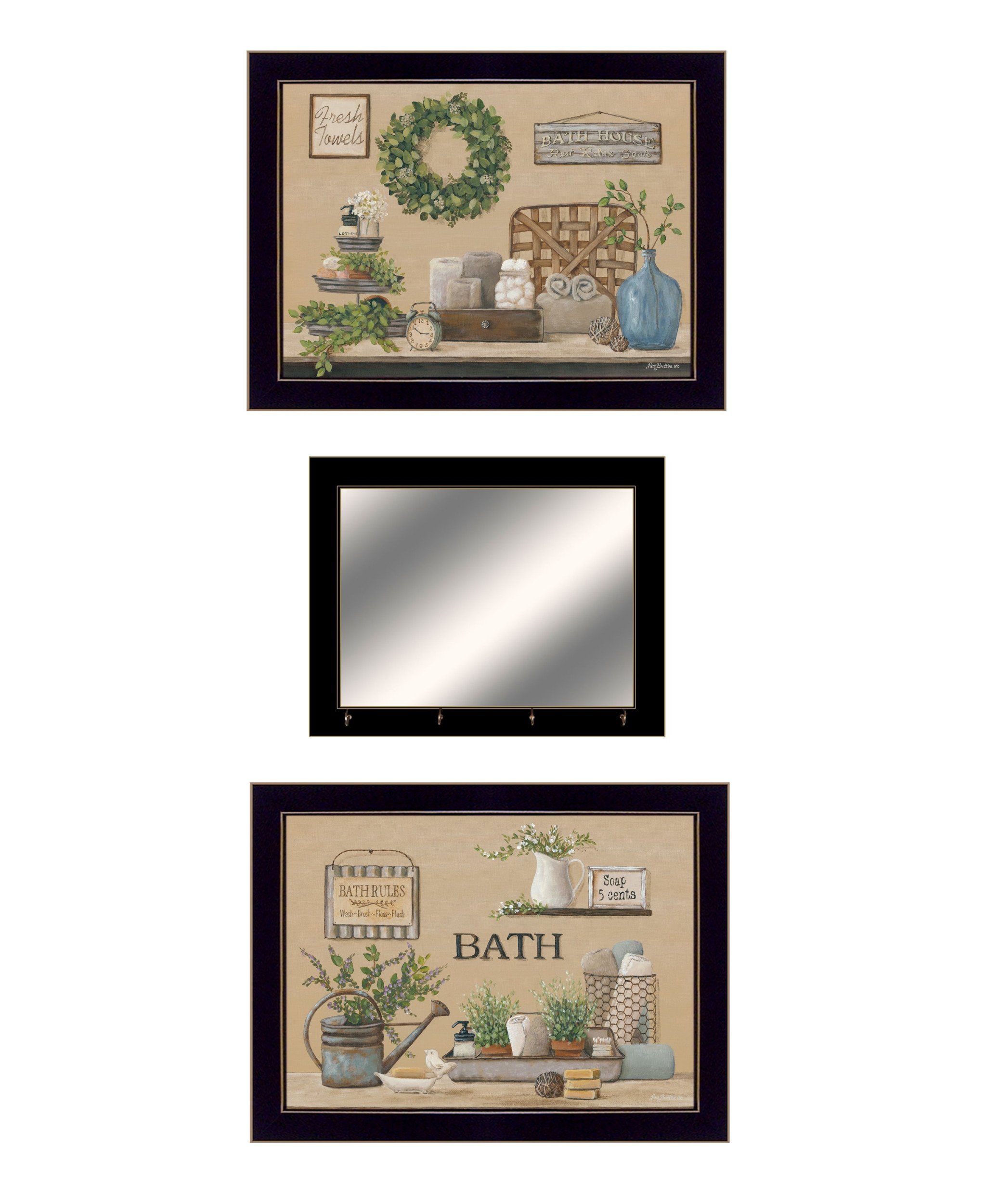 This set of three bath time 3 black framed print bath wall art with mirror will add a beautiful decorative accent to your decor. This print is a visual artistic expression that allows you to decorate your space in style. Reproduced for you on paper, this hanging decorative accent will be a trendy and fashionable way to dress your walls. Hang on your wall to add some up to date fashion and decoration. Instantly liven up your space with this art that brings color and dimension to your walls. 14 inches H x 18 inches W x 1 inches D