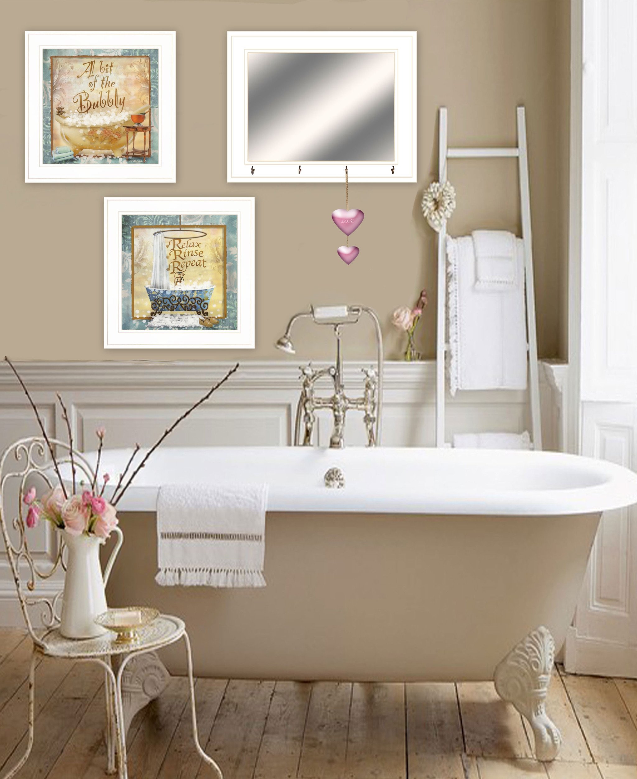 Bring some sizzle to your space with this eye-catching set of three bit of bubbly white framed bathroom wall decor. This set is a visual artistic expression that allows you to decorate your space in style. Reproduced for you on paper the prints are a trendy and fashionable way to dress your walls. In addition to the cute wall art, this set includes an accent mirror with hanging hooks for your keys, towels, and more. 15-inch H x 15-inch W x 1-inch D