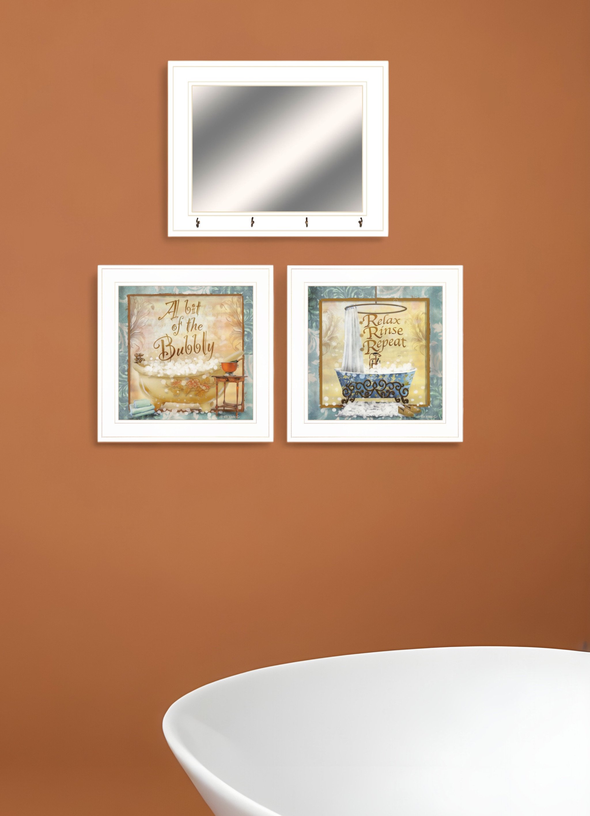 Set Of Three Bit of Bubbly White Framed Bathroom Wall Art With Mirror And Hooks